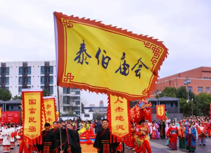 “正月初九拜泰伯,稻谷多收一二百!”泰伯即吴太伯。每年正月初九泰伯生日,设有梅里泰伯庙会。这是无锡一年中的第一个庙会,城乡百姓到此朝拜,盛况空前,历年不衰。我国申报的“春节——中国人庆祝传统新年的社会实践”项目成功入选《人类非物质文化遗产代表作名录》,其中包括无锡泰伯庙会。2025年的泰伯庙会活动更加精彩,新增国际友人队、汉服队等特色巡游队伍,庙会现场还有传统市集、灯会、水上表演、打铁花、灯光秀、水幕秀等项目,让各地游客沉浸式感受泰伯庙会独特的民俗文化。
