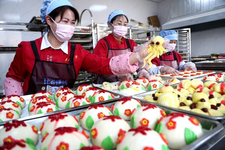 徐州人过年爱蒸花馍,寓意着新的一年红红火火、蒸蒸日上。花馍起源于中国民间祭祀与祈福活动,流行于北方,用多色面料,有实心的,有包馅儿的。放入红枣、红豆等食材,塑造一些祭祀和吉祥祛邪的动物造型,以及塑造花朵与果品。造型生动、夸张、艳丽,制作精巧细腻,兼具食用、观赏、礼仪等功能。