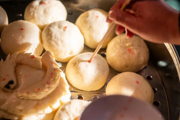 团子、馒头意味着阖家团圆、团团圆圆。每年到了常州人俗称的“年三夜四”,此时的“头等大事”就是做团子、蒸馒头。待到热气腾腾的团子出锅,人们还要特意化开一碗洋红粉,用筷子蘸上为团子“点红”。人们对生活红红火火的期盼就这样转化为这灵魂一点,浓缩在每一个团子上。
