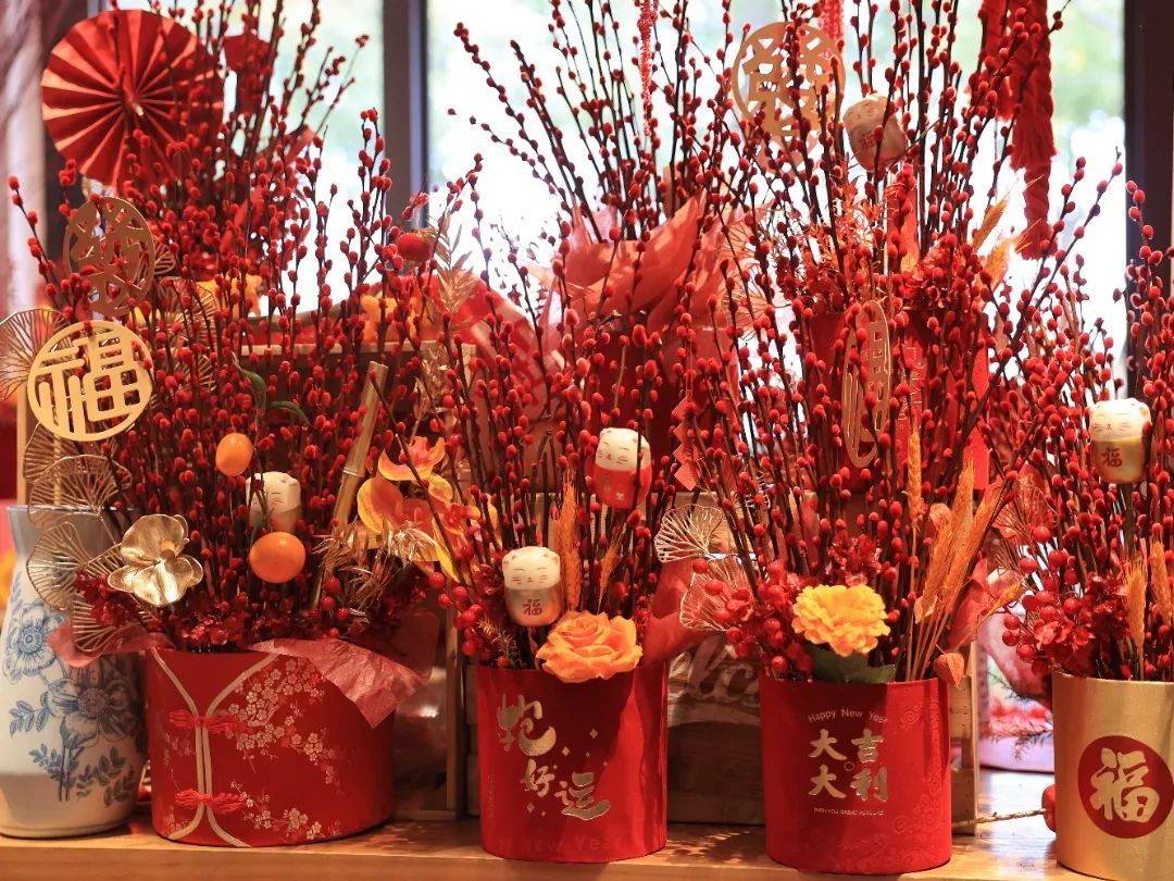 福桶的主花是银柳,银柳、银柳把银子留下,为了迎合春节的中国红,花匠们将银柳染成了红色,红色的银柳搭配点金色的装饰,象征着日子红红火火,生活充满阳光,格外喜人。