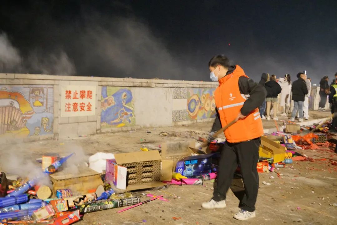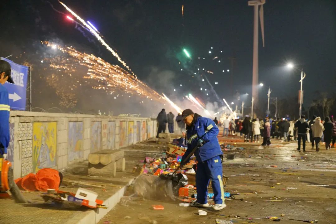 用扫帚和清洁车将地面的烟花残屑清理得干干净净
