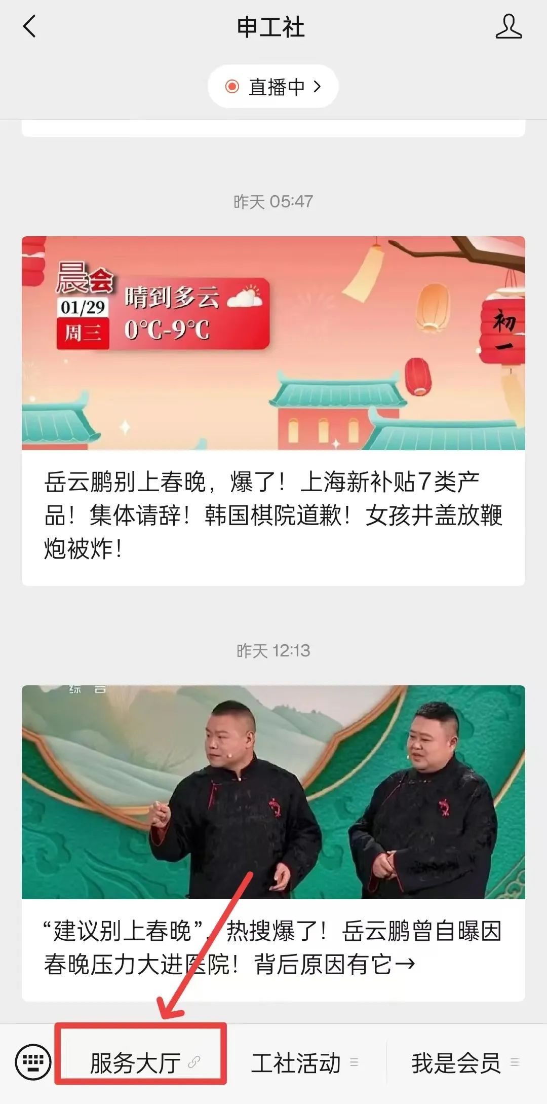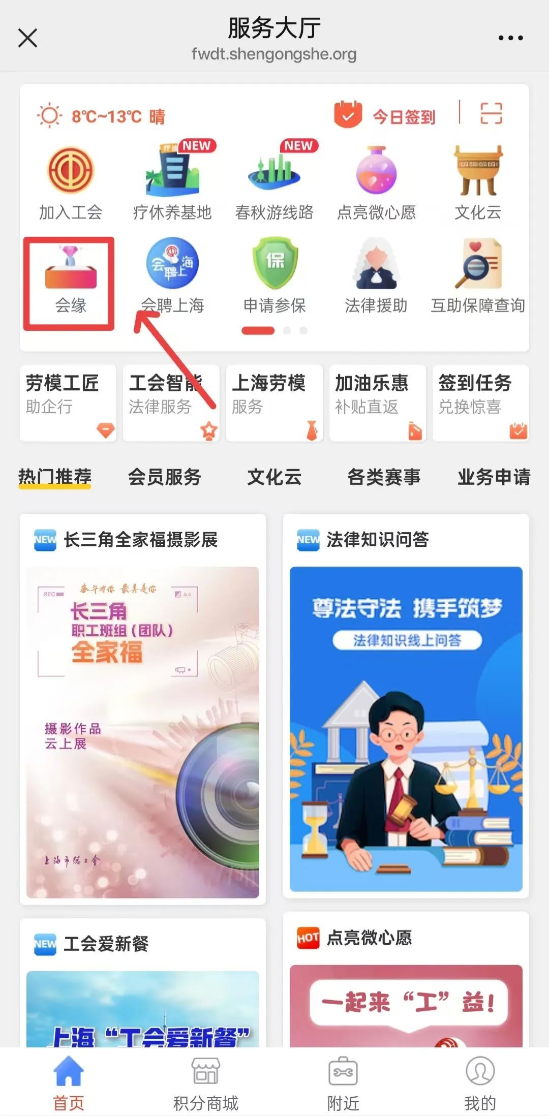 进入申工社微信公众号,点击底部菜单栏【服务大厅】,点击进入【会缘】。
