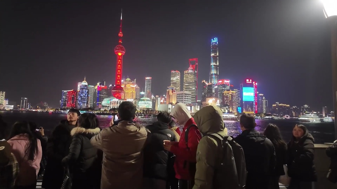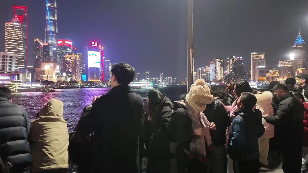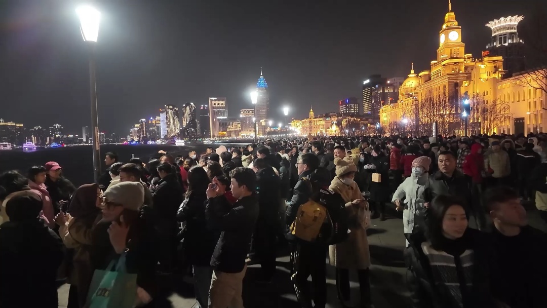 晚上7点,外滩观光平台已是人潮涌动,热闹非凡。市民和游客们聚集在江堤边,目光紧盯着浦江对岸那绚烂多彩的夜景,欢声笑语交织在一起,共同营造出新年的喜庆氛围。