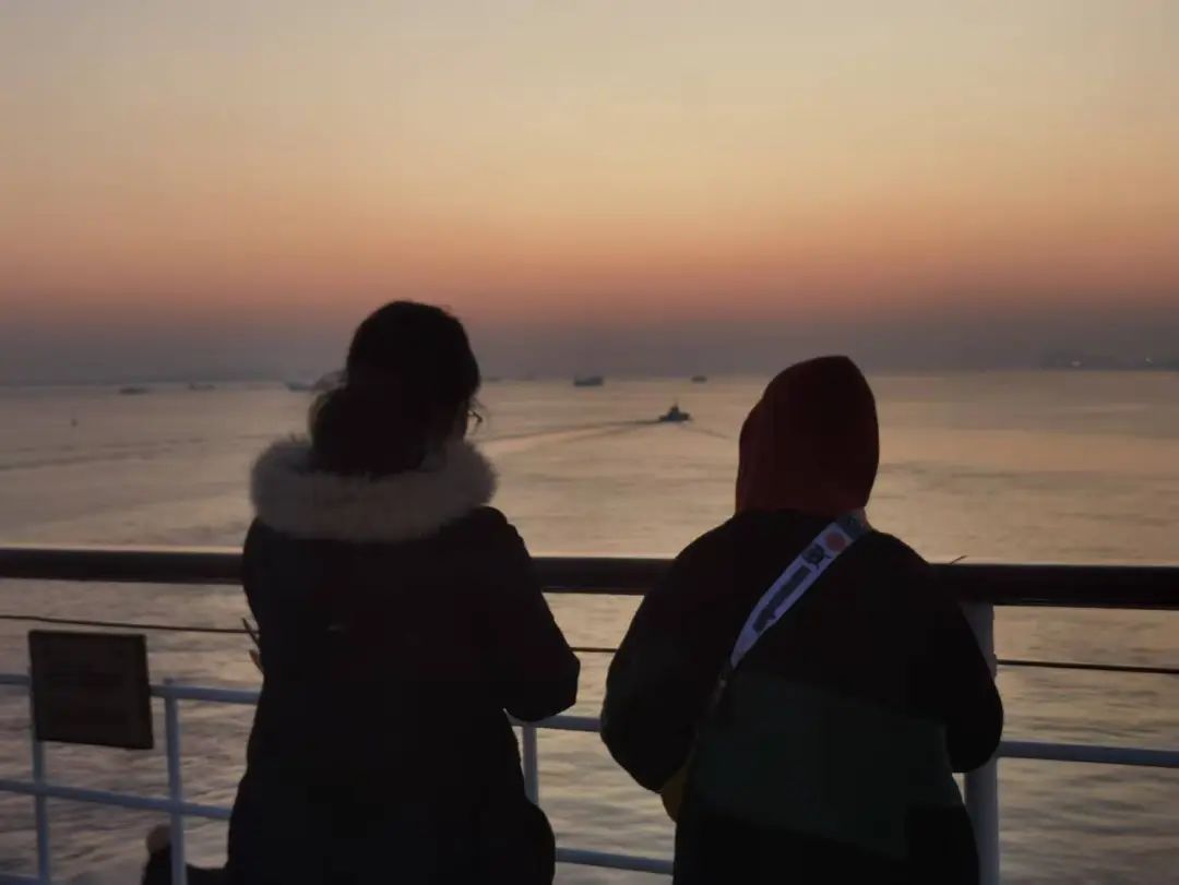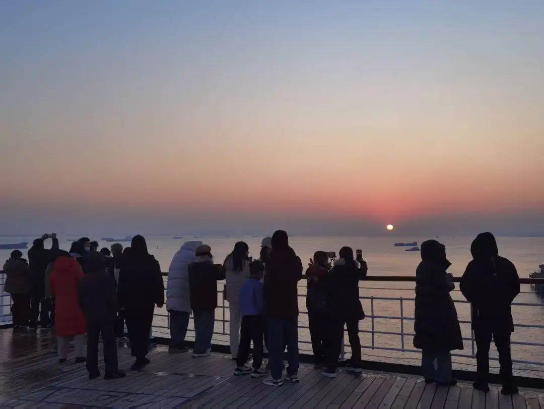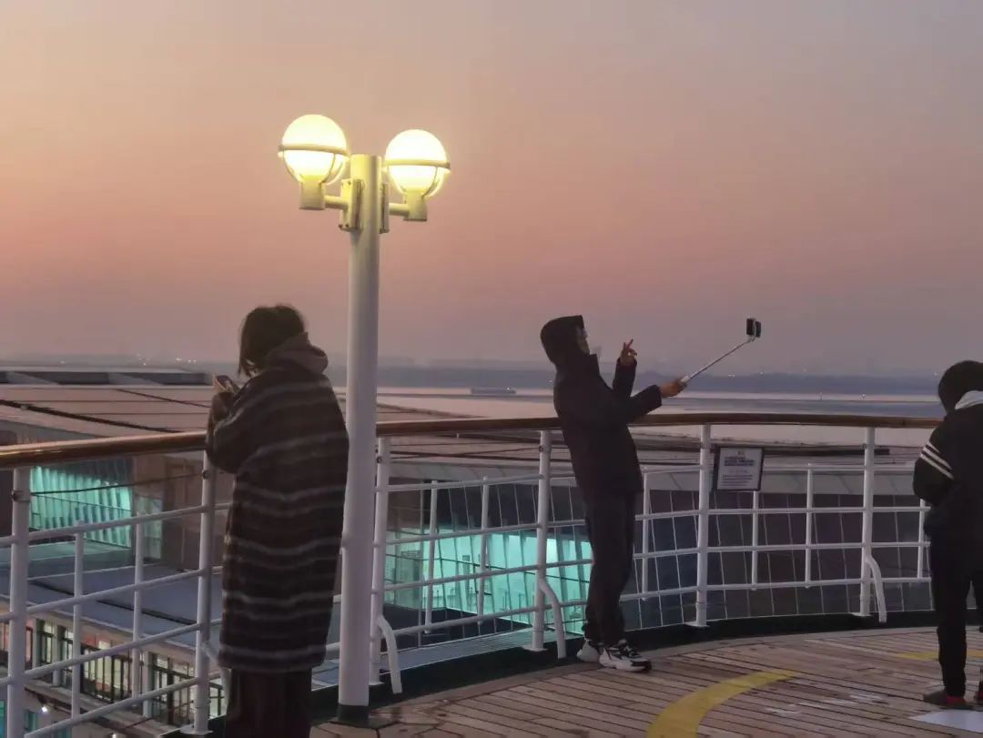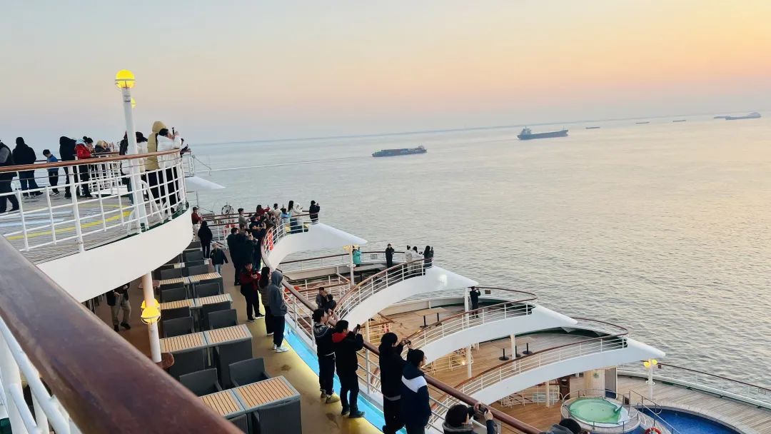 当天,游客们热情高涨,早早来到甲板上,架起相机,满心期待着日出的那一刻。当第一缕曙光穿透云层,“日出江花红胜火,春来江水绿如蓝”,在这辽阔的大海之上,初升的太阳比江岸的鲜花还要红,海水也仿佛被染上了春天的色彩,美得令人窒息。游客们纷纷按下快门,记录下这美好的瞬间。