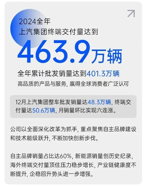 纵观全年,上汽集团累计整车终端交付量高达463.9万辆,保持行业领先。亮眼的数据,就是上汽集团逆风翻盘最有力的见证 ,彰显了其深厚的底蕴与强大的韧性。那么,上汽集团又是如何实现的?