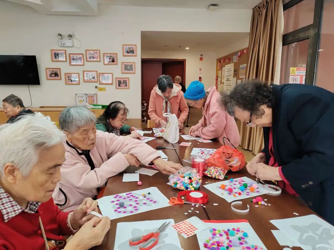 恒裕曹家渡老年福利院以“福”字作为主要活动元素,在大门入口处、老人房间门上都贴上“福”字,老人用彩色毛球拼“福”字,用毛笔写“福”字,满怀对新年的美好期许。