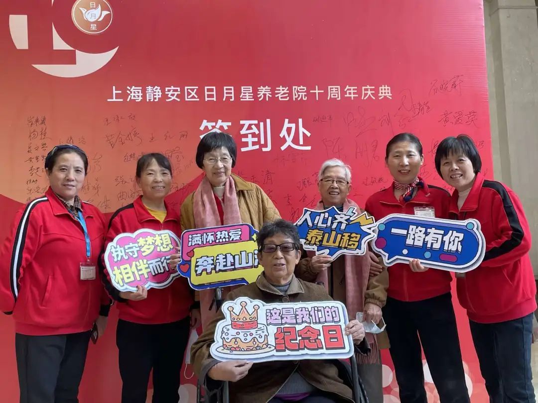 日月星养老院今年正值建院十周年,机构举行十周年庆典,住养老人纷纷在签名墙上签名留念,并与工作人员合照,记录这个难忘的时刻。
