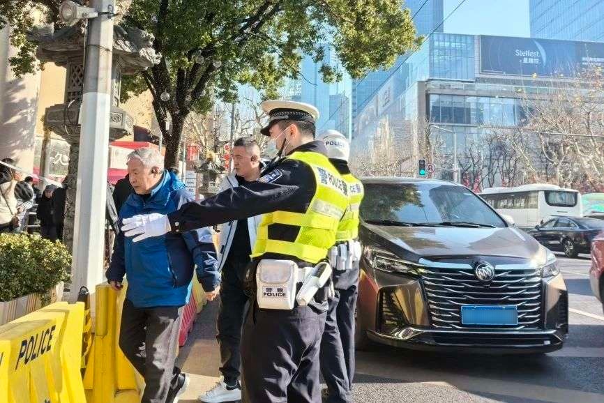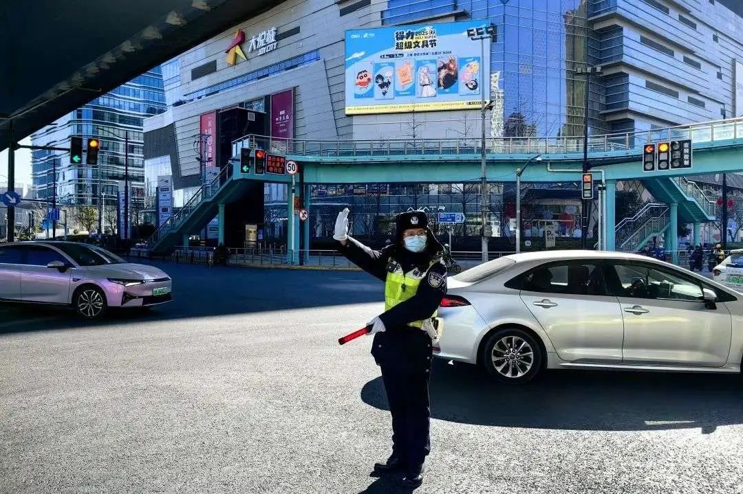 南京西路、大悦城、大宁久光商圈周边,新春的装饰光彩夺目,人潮熙熙攘攘。交警们时刻守护在周边道路,疏导交通,维持秩序。