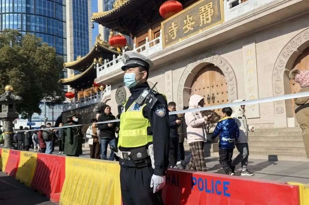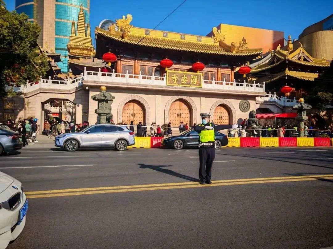 静安寺和宝华寺是辖区新春祈福的热门地标,静安交警增派人手,强化周边交通管理。