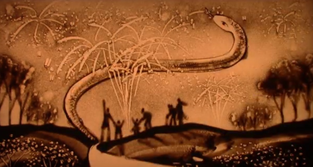 值得一提的是,金蛇作为蛇年的象征,也在沙画中得到了生动的展现。只见璀璨烟花绽放后,寓意着富贵与吉祥金蛇随即到来。金蛇的形象与春节的喜庆氛围相得益彰,为沙画作品增添了更多的文化内涵和美好寓意。