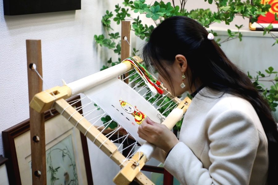 该绣品由绣师一针一线手工绕丝,针法较单面绣而言更为复杂,需耗时2天左右绣制。