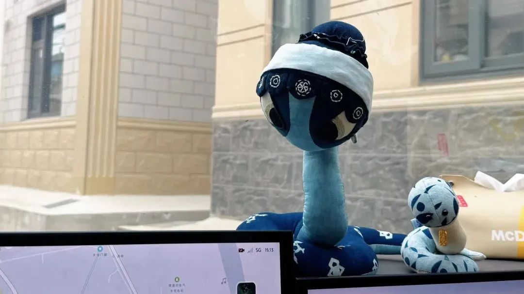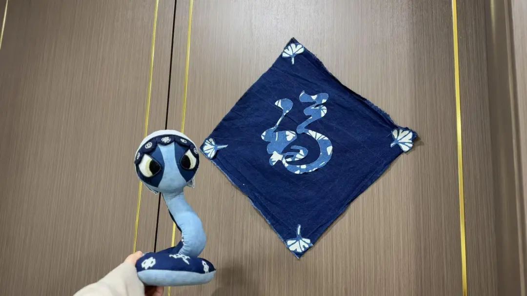 该绣品利用AI技术进行初创,图案中蛇宝头戴传统六合帽、脖系围巾,寓意国泰民安、衣食富足;蛇身形似“巳”字,寓意福气满满;腹下点缀圆铜钱,寓意财源滚滚。单幅绣品采用传统的平针绣技法,需耗时5-7天绣制。