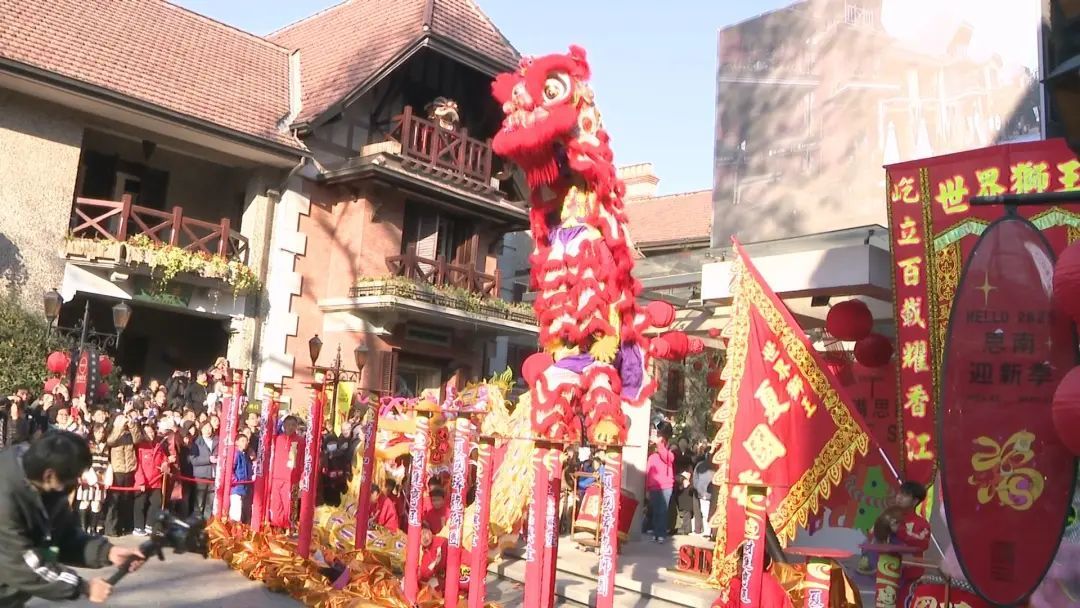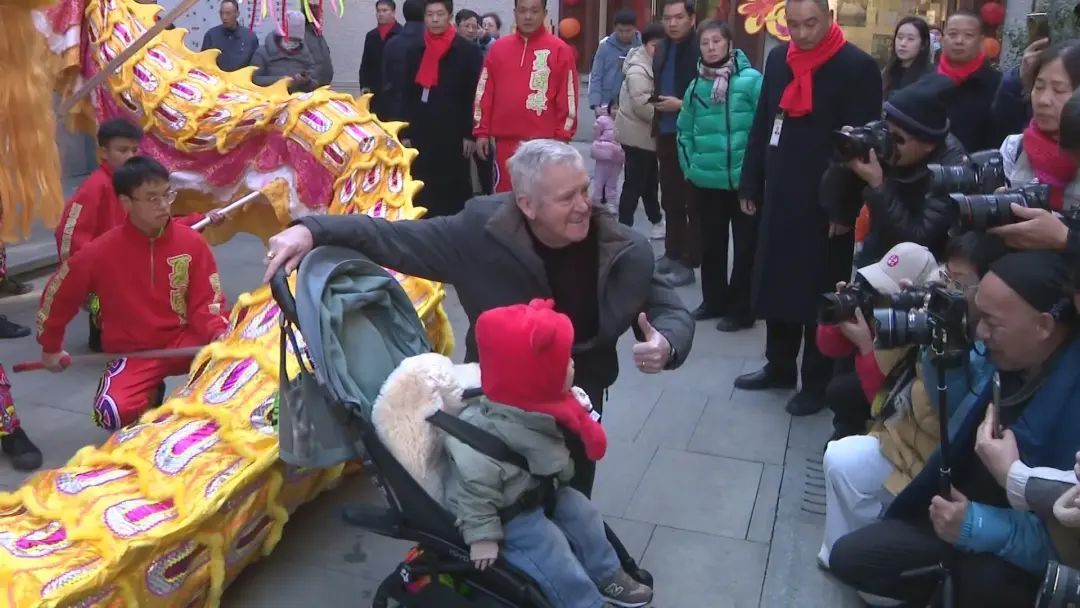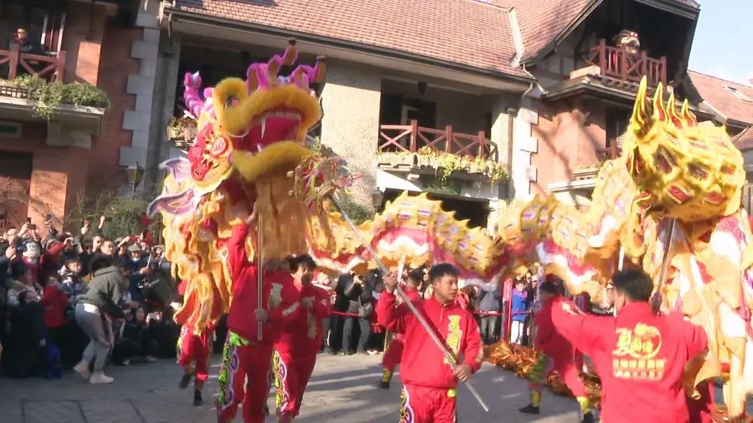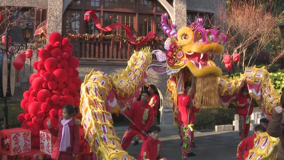 而舞龙表演也是十分精彩,长约30多米的黄龙身披龙鳞,不时口吐莲花,为市民游客纳祥送福。外国友人也被眼前的热闹场面所吸引,忍不住在恭贺新禧的条幅前拍照留念。“这个新年的舞龙舞狮的场面非常大,难度非常高,很难得能够看到这么大的场面,新年的味道非常浓。”