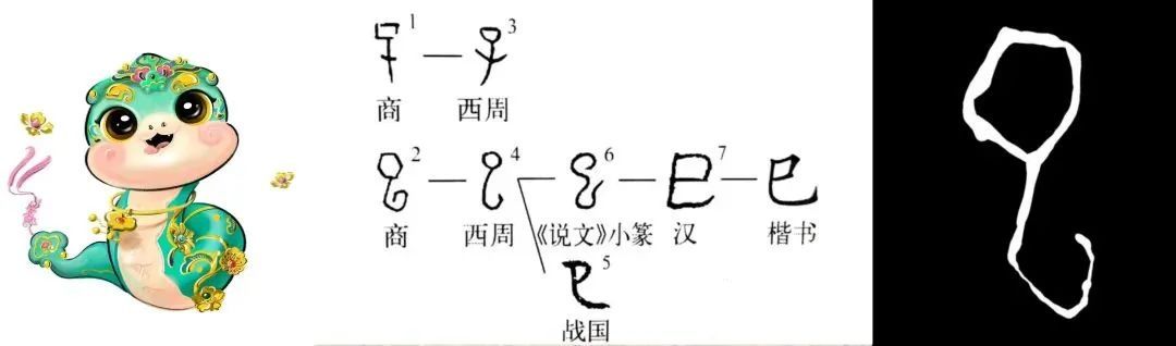 除了利用谐音这一手法,从视觉造型的角度审视,近三年来春晚的主标识设计均巧妙地融入了书法元素,展现出丰富多彩且高雅大气的美学风貌。设计师们将甲骨文中的“巳”字进行艺术化处理,将其幻化为“灵蛇吐信”的生动形态,并进一步通过对称反转与拼合,创造出“巳巳”并肩的独特构图。