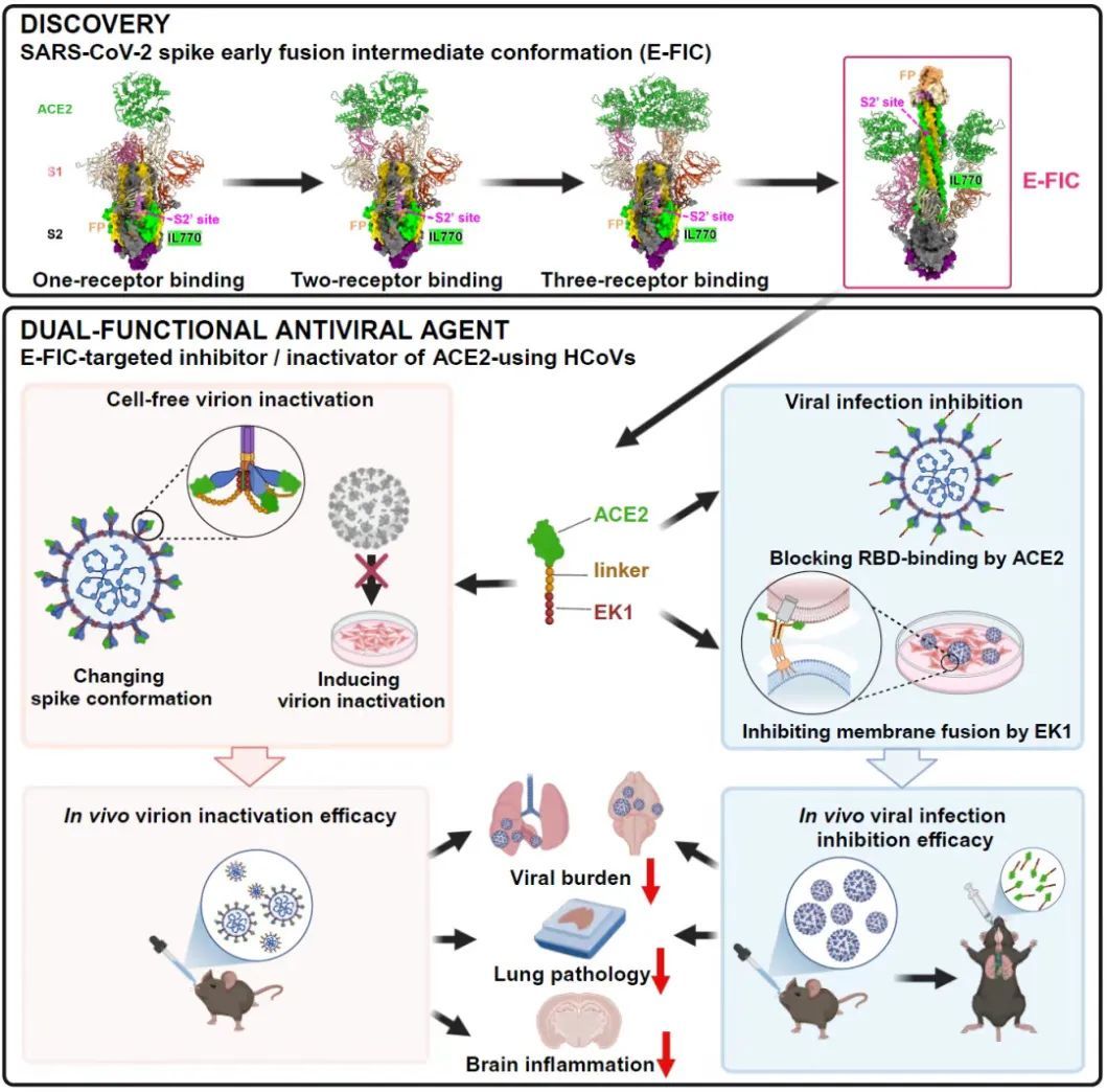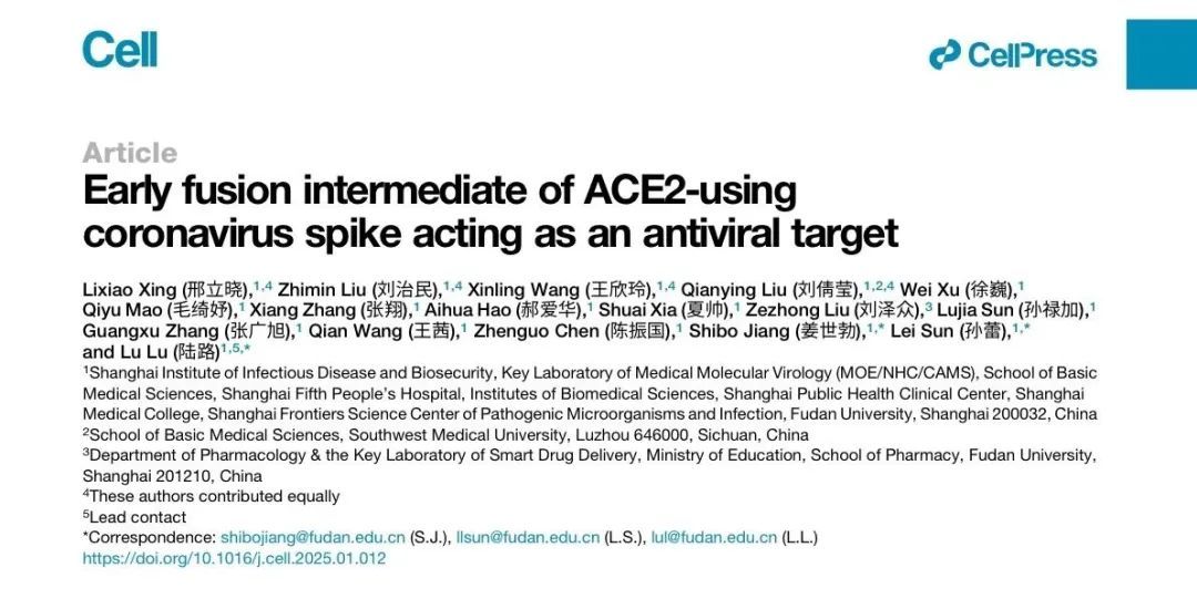 2025年1月30日,复旦大学上海医学院陆路研究员、孙蕾研究员、姜世勃教授团队合作在《细胞》(Cell)杂志以Research Article的形式,在线发表了题为“Early fusion intermediate of ACE2-using coronavirus spike acting as antiviral target”的研究论文。该研究发现了ACE2受体诱导的冠状病毒刺突蛋白早期融合中间态构象(E-FIC),并针对该中间态构象设计了高效、广谱、兼具失活病毒和抑制病毒感染的双功能抗冠状病毒候选药物。