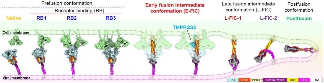 但目前仍有一个关键问题尚未明确——刺突蛋白从融合前状态转变为融合后状态时,究竟经历了怎样的构象变化。虽然已有研究者发现新冠病毒S2亚基中间态构象,但是对于早期的融合中间态,特别是介于受体结合和S1亚基脱落之间的S蛋白构象是否存在,及其变构细节等还一直处于认知盲区。