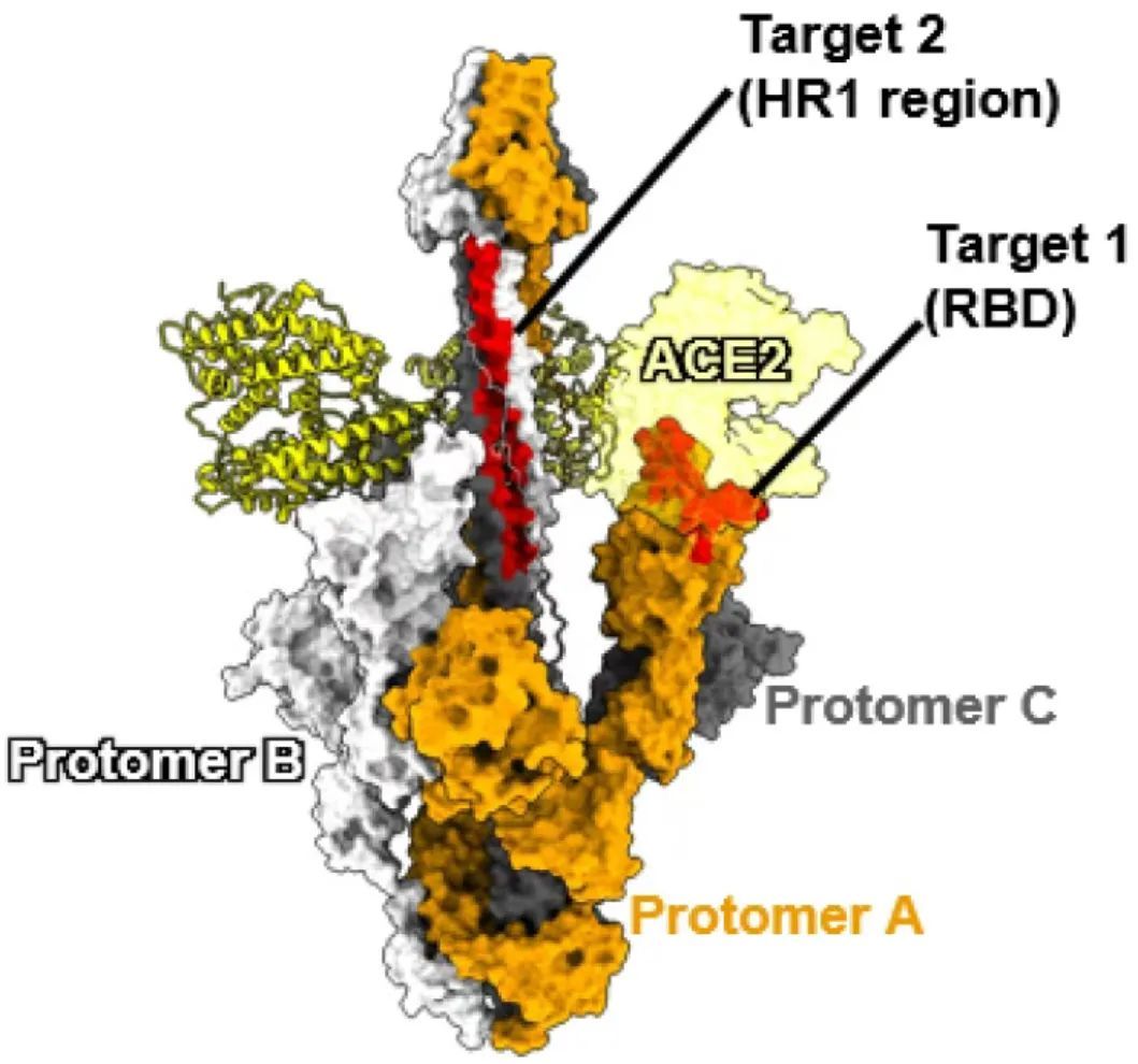 通过对E-FIC结构的分析,研究者还发现S1亚基中的RBD与S2亚基中的HR1之间的空间距离被拉近,这一发现也为靶向该中间体的药物设计提供了新思路(图2)。基于此构象,研究者选用了经临床试验证明具有较好活性和安全性的RBD结合药物候选(ACE2蛋白)和HR1的结合药物候选(EK1多肽),设计出双功能域串联药物候选。
