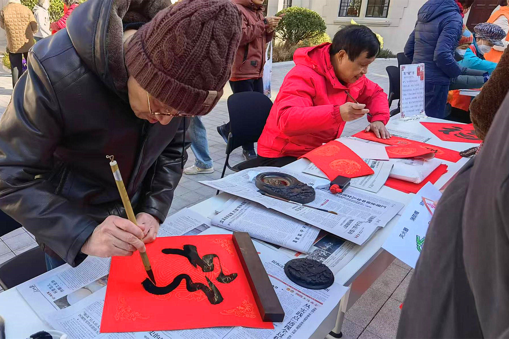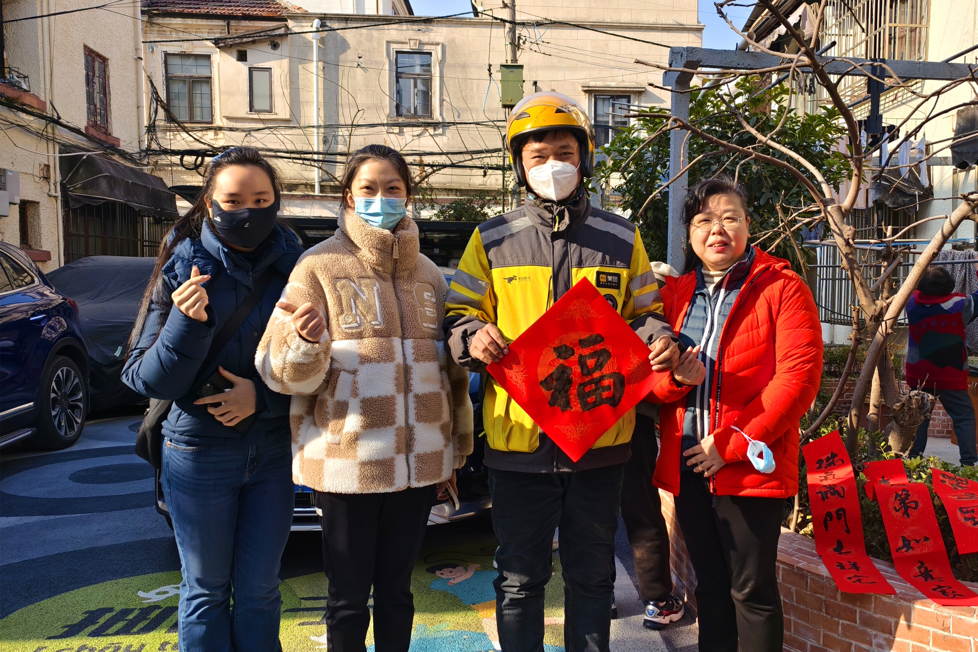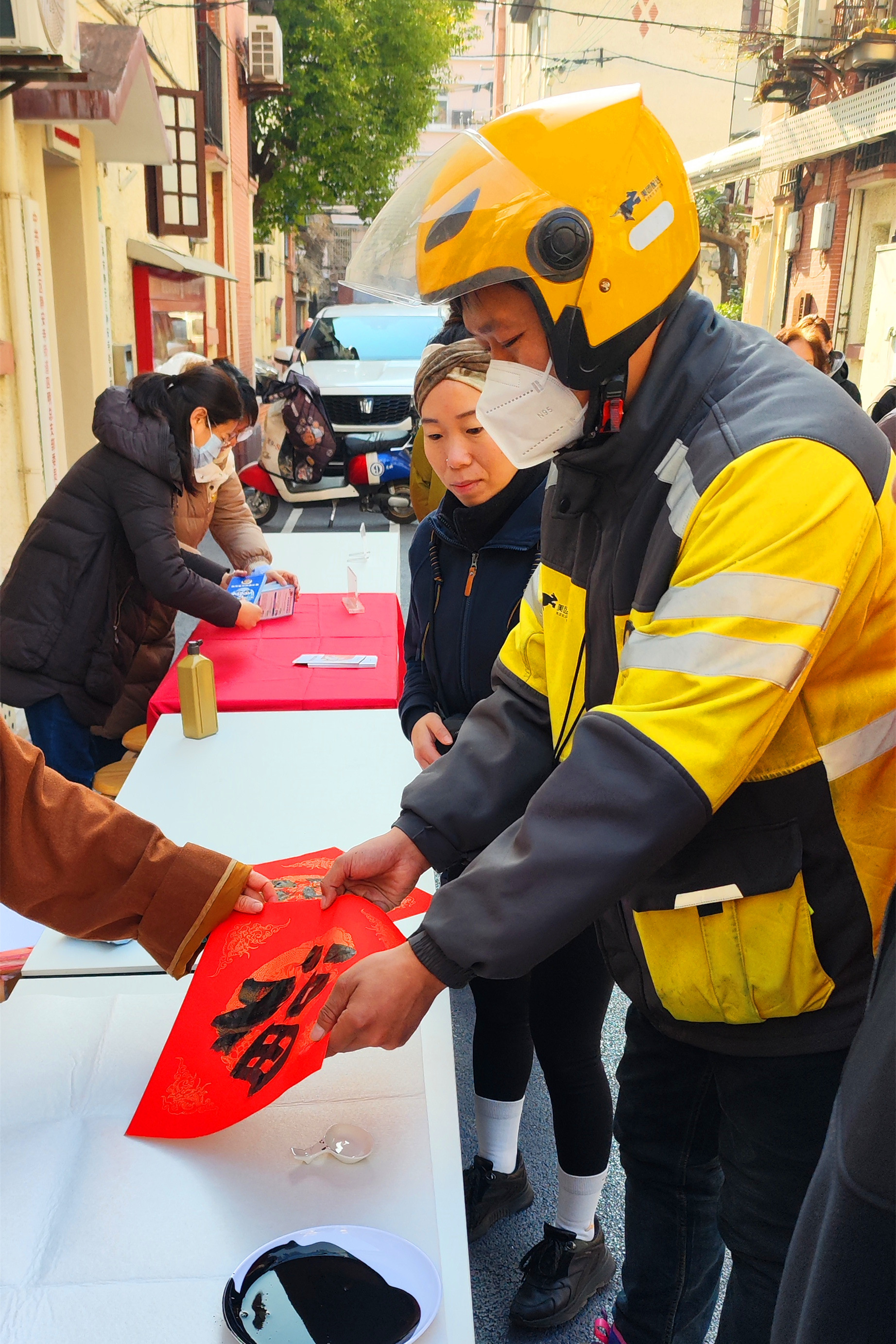 春节期间,不少新就业群体选择坚守岗位,留在上海过年。为了感谢他们的辛勤付出,各居民区纷纷联动社会资源,邀请上海市文联、市书法家协会、静安寺、圆明讲堂等区域单位为他们写春联和“福”字,道一声“新年好”。