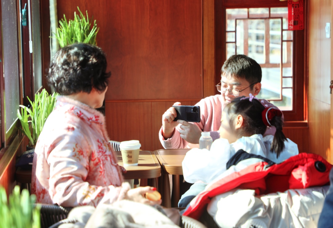 游船咔吧是瀛东村春节期间首次推出的休闲项目,东湖之畔,波光粼粼,两艘别具一格的画舫静静靠在岸边,新鲜研磨的咖啡香气四溢,游客临窗赏景,品味咖啡,远处横跨的灜缘桥、凌波而飞的水鸟......构成了一幅美妙的画卷,馥郁浓香的咖啡让人沉醉不归。