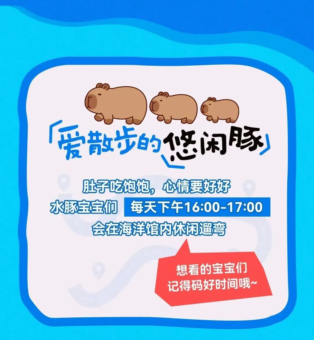 这个春节,快去云上海洋馆找卡皮巴拉玩吧。告诉你一个好消息:每天16:00—17:00,4只卡皮巴拉还会走出它们的家,在海洋馆内休闲遛弯。你不仅可以抚摸它,还可以喂食、与它合影。总之,想看卡皮巴拉的宝宝们记得码好时间哦。