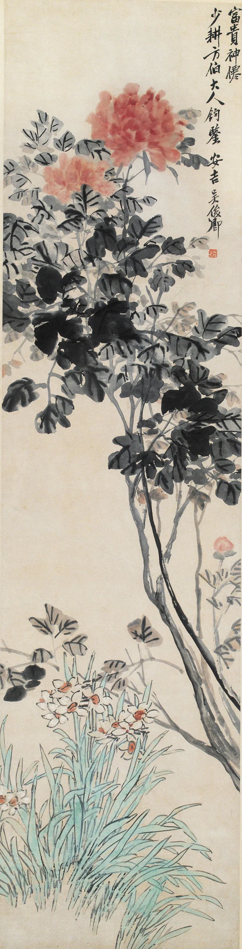 吴昌硕的花卉受徐渭和八大影响最大,花卉中又以梅、兰、水仙、紫藤、天竺最为常见,都为折枝、没骨写意,设色为多,善用大红大绿,且不失高雅之态。其中,他的牡丹画以重气尚势、浑厚豪放为宗,色彩浓重而不失雅致;画水仙时则善于运用明快的造型、活跃的色彩和质朴的意趣来表现水仙的优雅高洁。