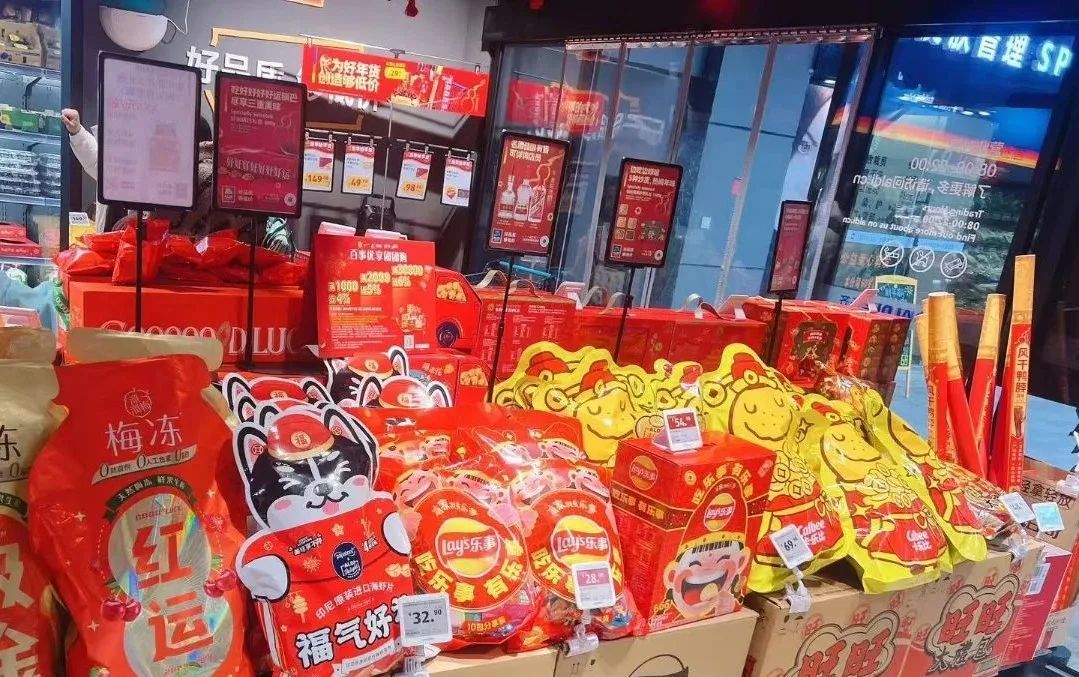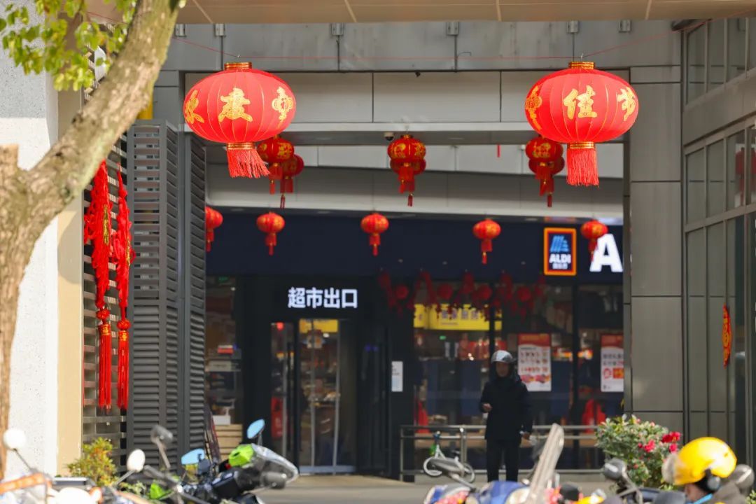 走进位于万源坊的奥乐齐超市,浓浓年味扑面而来,高高挂起的中国结和金灿灿的福字令人耳目一新,传递着节日的喜庆氛围。