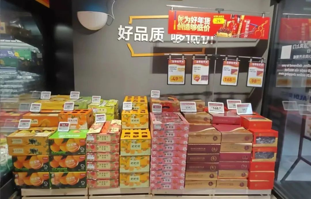 春节期间,超市特别推出了多种应季生鲜产品,包括各类新鲜蔬菜、水果、海鲜以及肉类。得益于源头直采模式,超市产品物美价廉。其中,寓意吉祥的橙子、苹果等礼盒,深受消费者欢迎,成为年货市场的热销品。