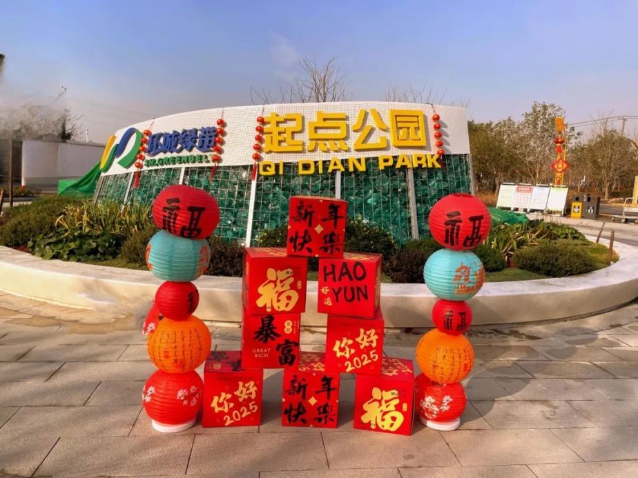 起点公园遵循“生态、自然、野趣、静谧”的总体定位,最大程度保留现状自然资源,以“生态+运动+生活”为主题,打造环城绿带活力运动休闲公园。春节期间,起点公园盛装打扮,诚邀市民游客前来共度欢乐时光。踏入公园大门,迎接大家的是“新年快乐”的祝福摆件,两边的灯笼则预示着来年的吉祥和期望。