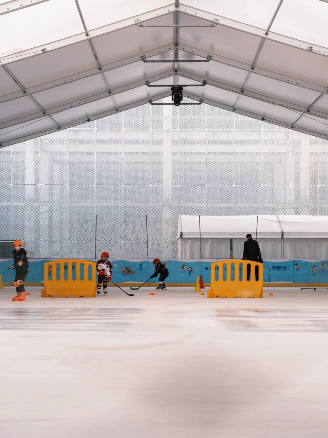这里的溜冰场可同时满足溜冰和冰球两种运动的练习,人也不多,新手们可以在此放开练习。