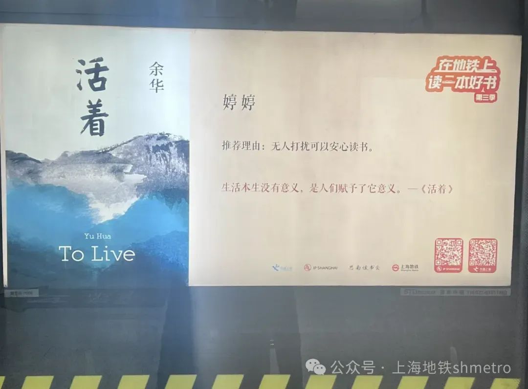 地铁静安寺站的活动灯箱推荐的是书籍《活着》。