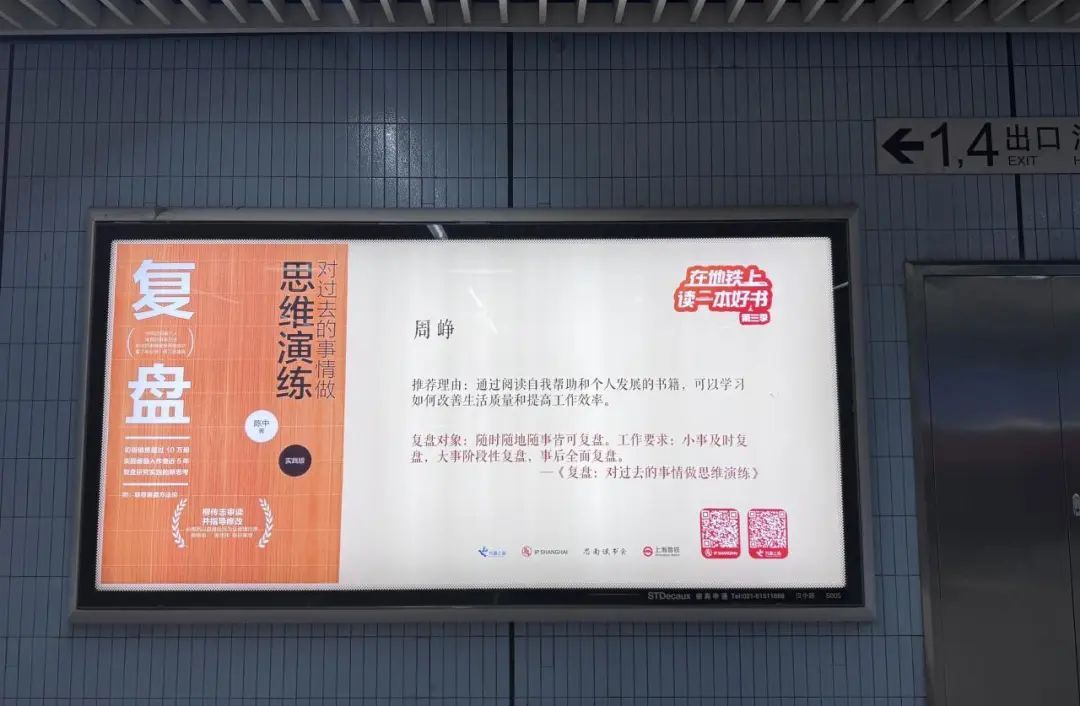 记者在地铁汉中路站看到了此次活动的灯箱。读者介绍了书籍《复盘:对过去的事情做思维演练》,并阐述了推荐理由:通过阅读自我帮助和个人发展的书籍,可以学习如何改善生活质量和提高工作效率。