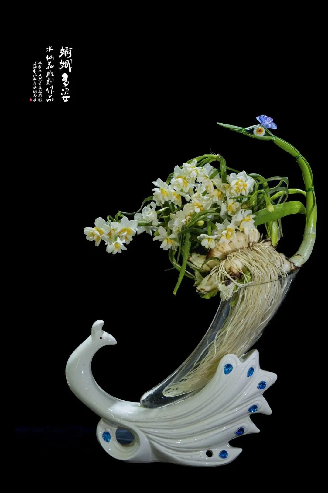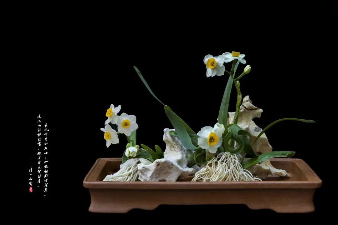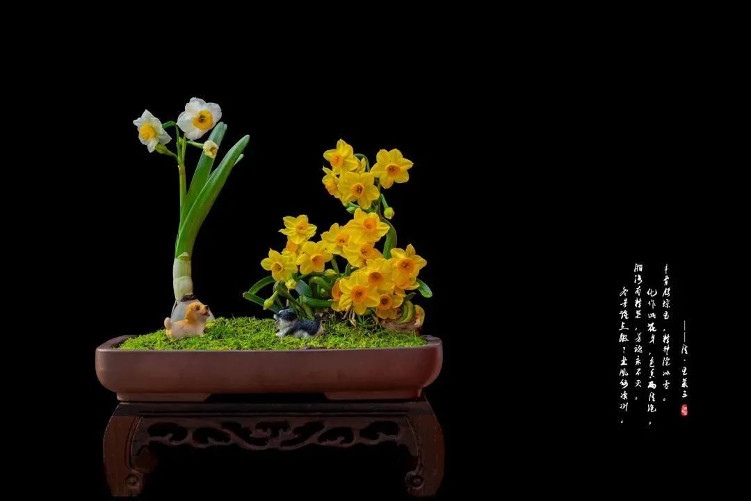 “豪放派”水仙雕刻大师杨明国擅长通过雕刻手法控制水仙的生长,达到“根长、杆矮、叶绿、花繁”的效果,作品往往花型饱满奔放,热烈芬芳。他的作品《金鱼戏水》通过精心雕刻呈现或笔直或弯曲形态的花叶,充分利用花和叶摆出形态,末簇舒展,花朵回首顾盼,楚楚可人,叶如碧剑、娇瓣如雪,花蕊如金,姿态秀美飘逸,白绿黄清雅的三色,下端数朵水仙花团聚在一起争相斗艳,搭配装饰点缀,仿佛一只戏水的金鱼跃然水上,喜庆祥和,颇具年味。