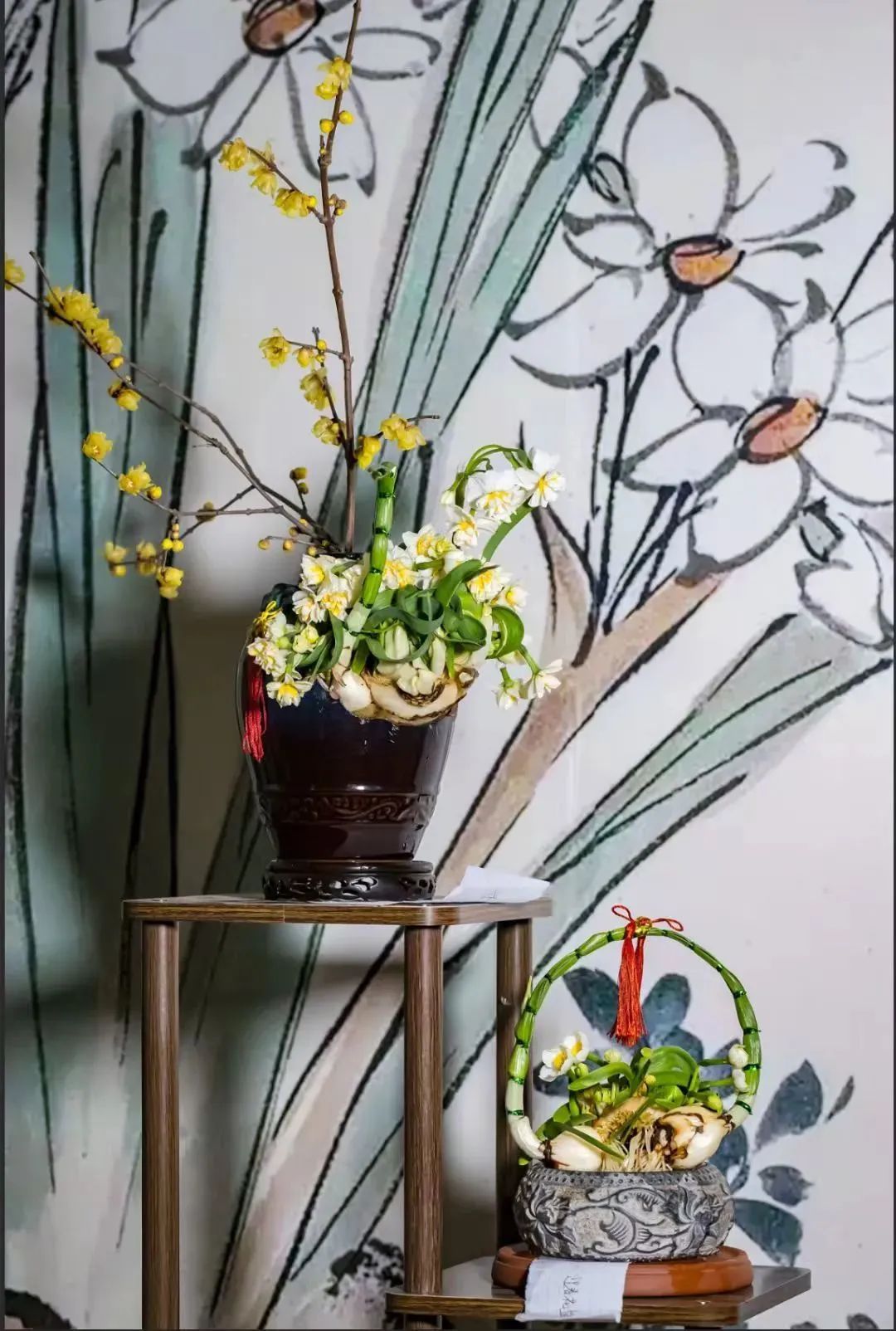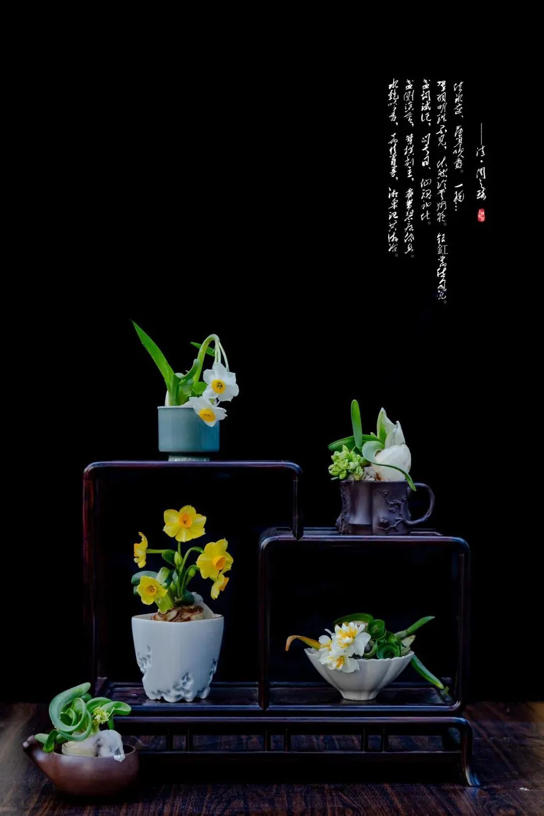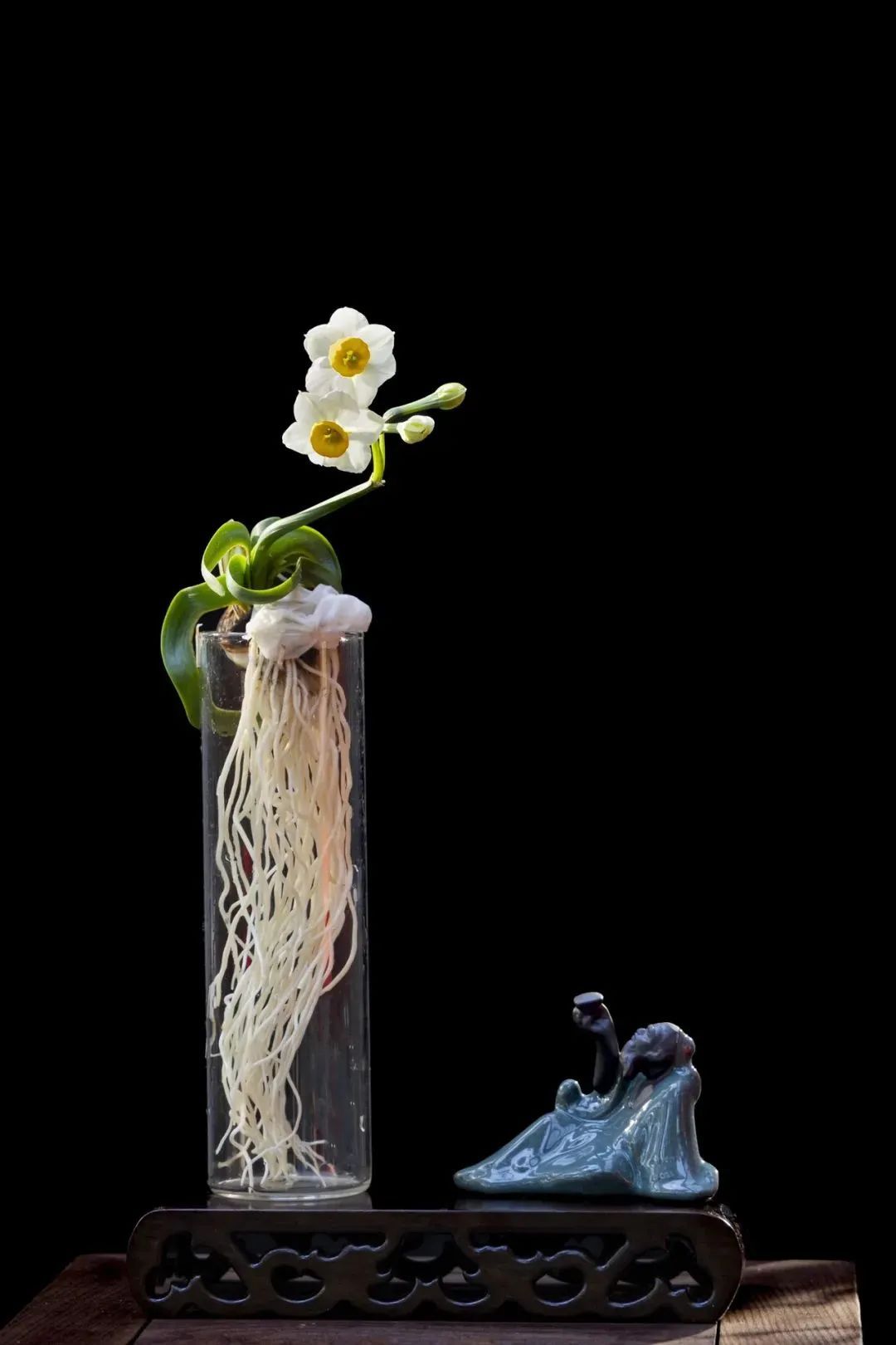 “豪放派”水仙雕刻大师杨明国擅长通过雕刻手法控制水仙的生长,达到“根长、杆矮、叶绿、花繁”的效果,作品往往花型饱满奔放,热烈芬芳。他的作品《金鱼戏水》通过精心雕刻呈现或笔直或弯曲形态的花叶,充分利用花和叶摆出形态,末簇舒展,花朵回首顾盼,楚楚可人,叶如碧剑、娇瓣如雪,花蕊如金,姿态秀美飘逸,白绿黄清雅的三色,下端数朵水仙花团聚在一起争相斗艳,搭配装饰点缀,仿佛一只戏水的金鱼跃然水上,喜庆祥和,颇具年味。