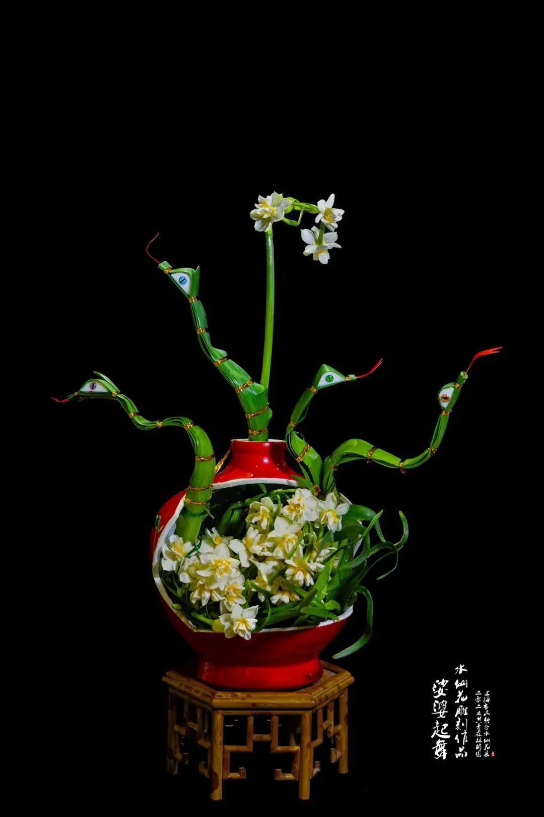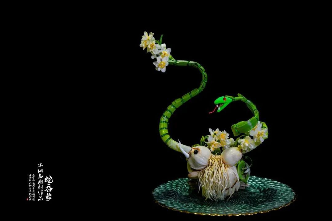 用手术刀雕刻水仙花是沪上“写实派”水仙雕刻大师倪明宪的一门“绝学”。他的刀工犀利,擅长造型类作品创作,雕刻造型栩栩如生,别致生动。今年他带来的作品《蛇吞象》,以中国传统俗语为灵感,通过精心雕刻和长势控制,呈现出一只栩栩如生的青蛇造型,又别出心裁地在水仙球上创作,创造出一只仿佛正在卧倒的大象形象,搭配洁白的花朵,颜色简净,生动有趣又引人遐想无限。