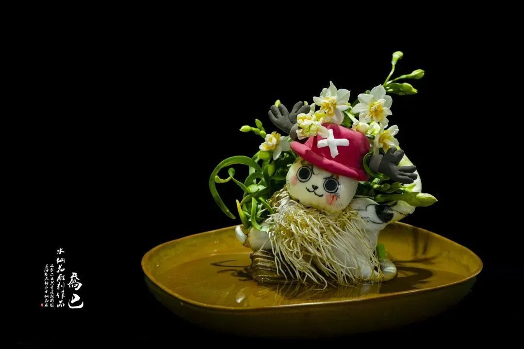 倪老师的爱徒们也秉承师风,在水仙球上“做文章”,《乔巴》《猫咪老师》均以人们耳熟能详的动漫形象为创作灵感,让清雅的水仙花也迸发出新的活力,令人印象深刻,大开眼界。
