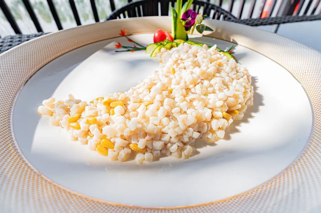 餐厅行政总厨刘震现场展示了这道菜肴的烹制。首先,要选取新鲜的淀山湖白水鱼,去骨去皮,切成米粒状。这一步骤不仅考验厨师的刀工,更需耐心与细致。切好的鱼米晶莹剔透,宛若珍珠。接着,把切好的鱼米放入碗中,加入盐、味精调味,倒入葱姜水去腥增香,再撒上生粉,用手轻轻抓匀,让每一粒鱼米都均匀裹上浆,上浆后的鱼米更加饱满,色泽诱人。