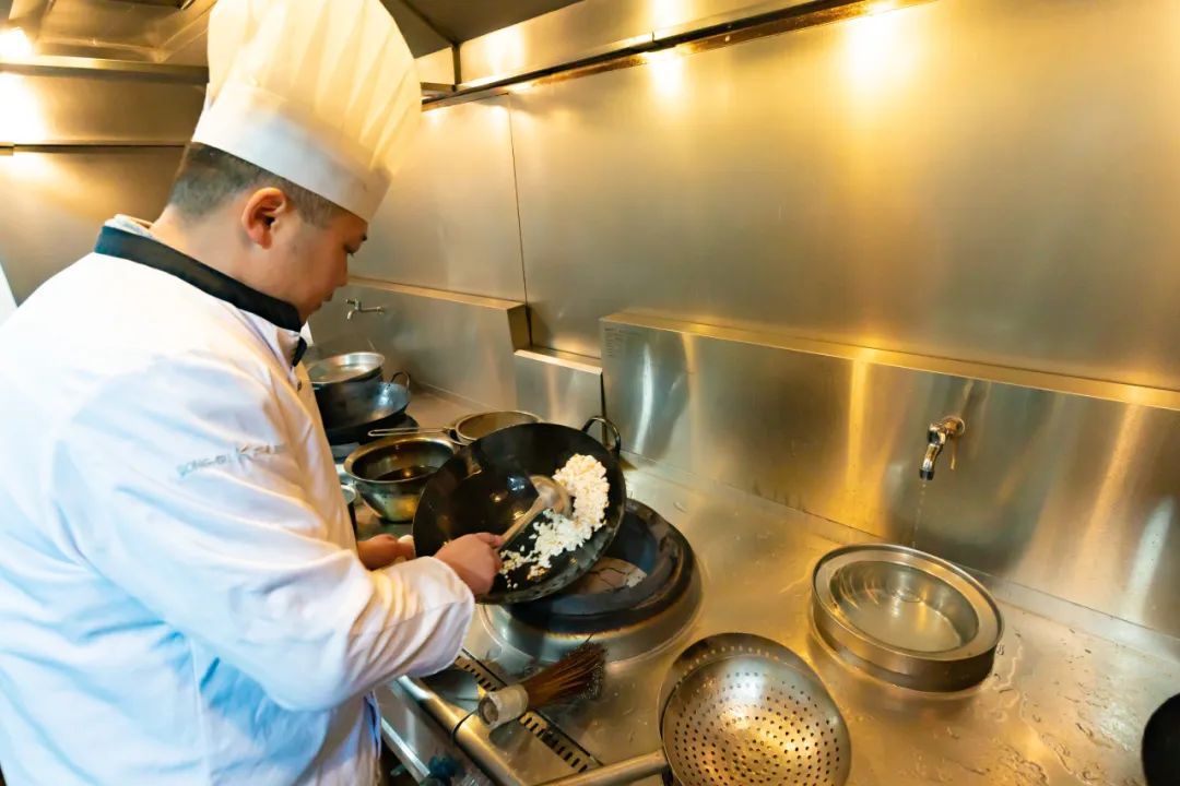 最后,将炒好的鱼米装盘,厨师巧妙地将其摆成麦穗状,金黄的鱼米与洁白的松子仁相互映衬,宛如一片丰收的田野,诠释出 “鱼米之乡” 名字的美好寓意。