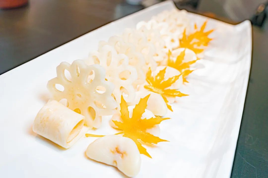 联怡枇杷园的冷菜“水乡三友”,也别具一格。选用练塘茭白、鲜菱角、脆藕这三种青浦特色水生作物为原料,经过切配、调味,冷拼而成。应季采集,融入一盘,三物三味,装盆高雅、口感爽脆,颇受欢迎。