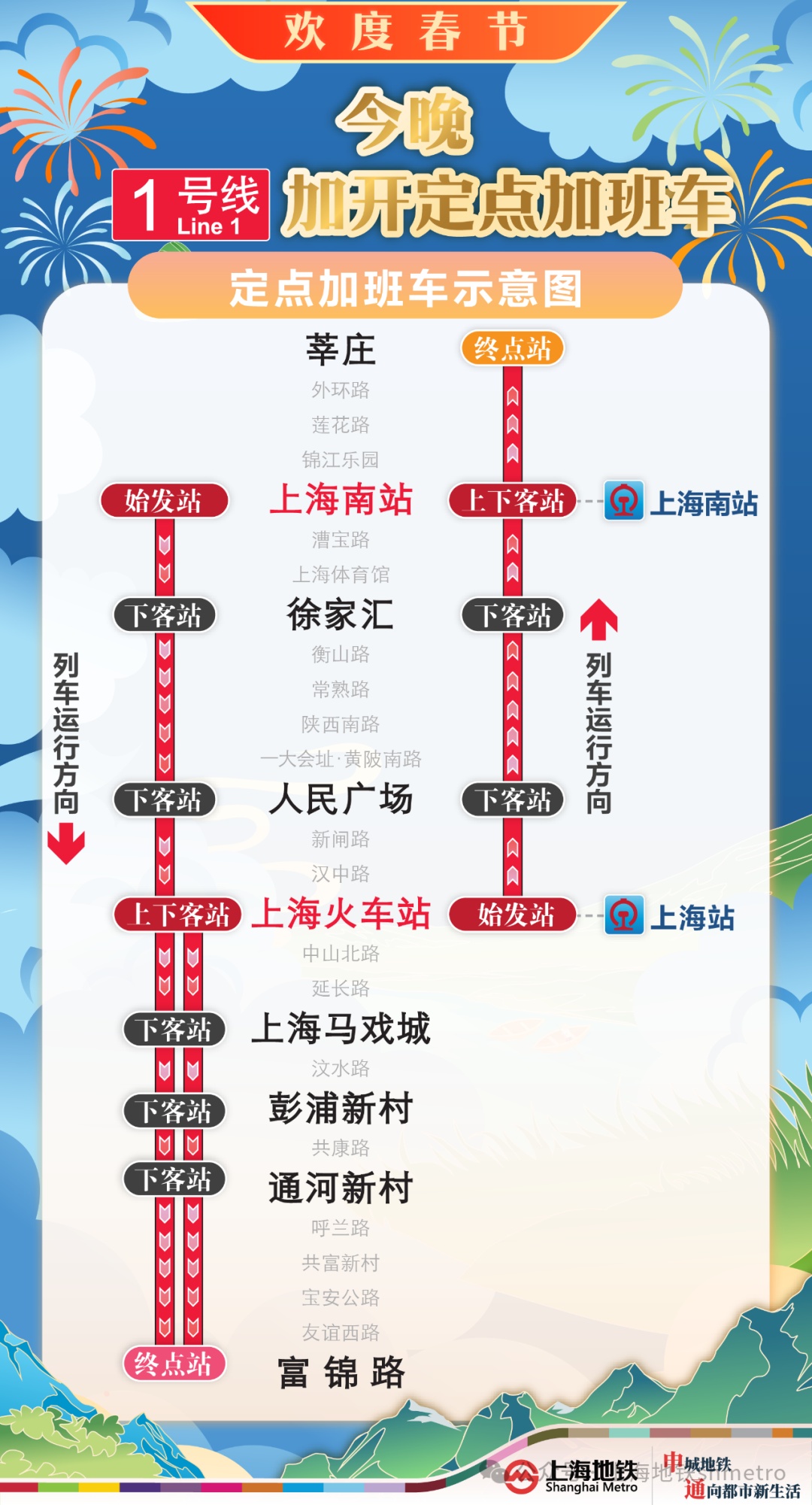 【1号线:上海火车站站往富锦路方向】在上海火车站站往富锦路站方向末班车(23:08)后,往富锦路站方向加开定点加班车至次日1:15,加班车停靠:上海火车站站、上海马戏城站、彭浦新村站、通河新村站、富锦路站(终点站),其余车站跳停。停靠车站中,上海火车站站(始发站),可上下客,其余车站只下不上。