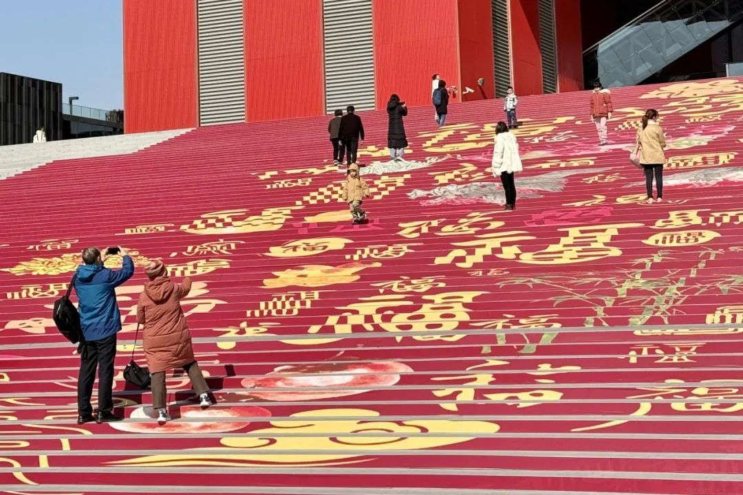 值得一提的是,灵感取自“海上明月·纪念吴昌硕诞辰180周年艺术大展”的巨幅火红葫芦地贴成为今年新春热门打卡点。本次葫芦地贴精心镌刻66个造型各异“福”字,且将缶翁画中的吉祥元素如“梅、柿、竹、水仙”等巧妙融入,还有趣味地贴打卡活动“福禄双全·祥蛇迎春”,观众们寻找祥瑞元素并合影留念,寄托一整年的美好祝福。