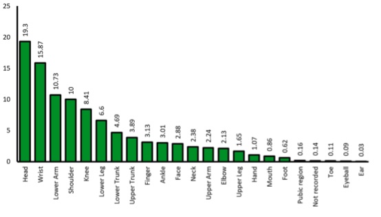 流行病学数据告诉我们,青少年滑雪最易受伤的部位是上/下肢,其次是头部、下背部和胸部/腹部。从受伤危害性而言,尽管头部和颈部受伤不如四肢骨骼受伤常见,但头颈部损伤严重时可能危及生命,需要特别加以重视。