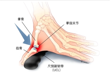 图一、常见的滑雪手撑地损伤——拇指UCL损伤