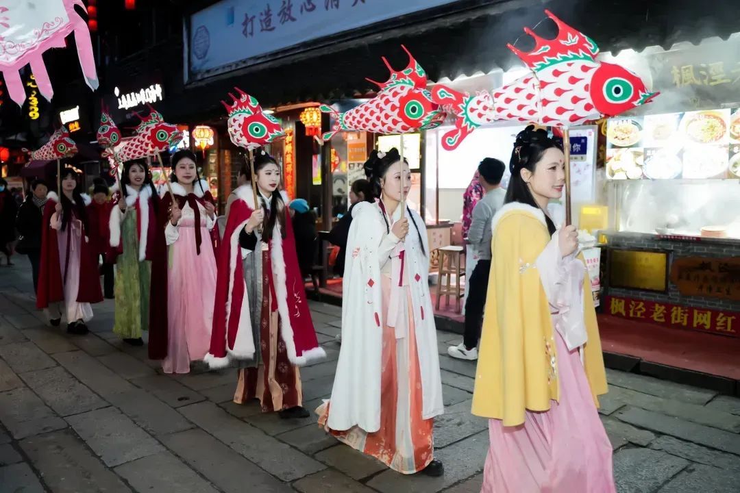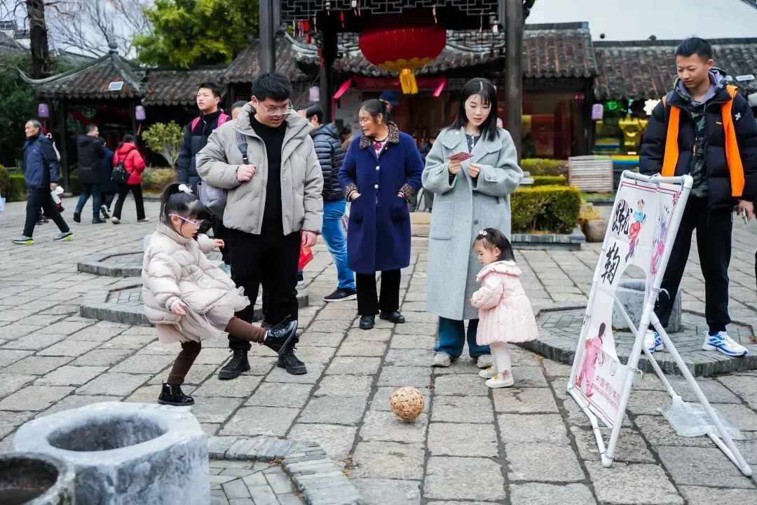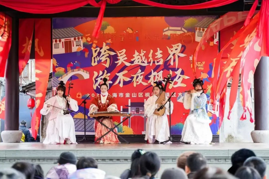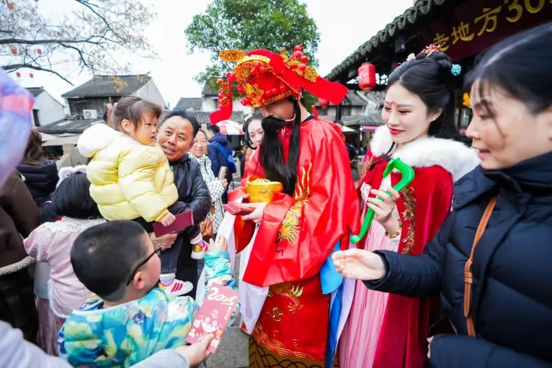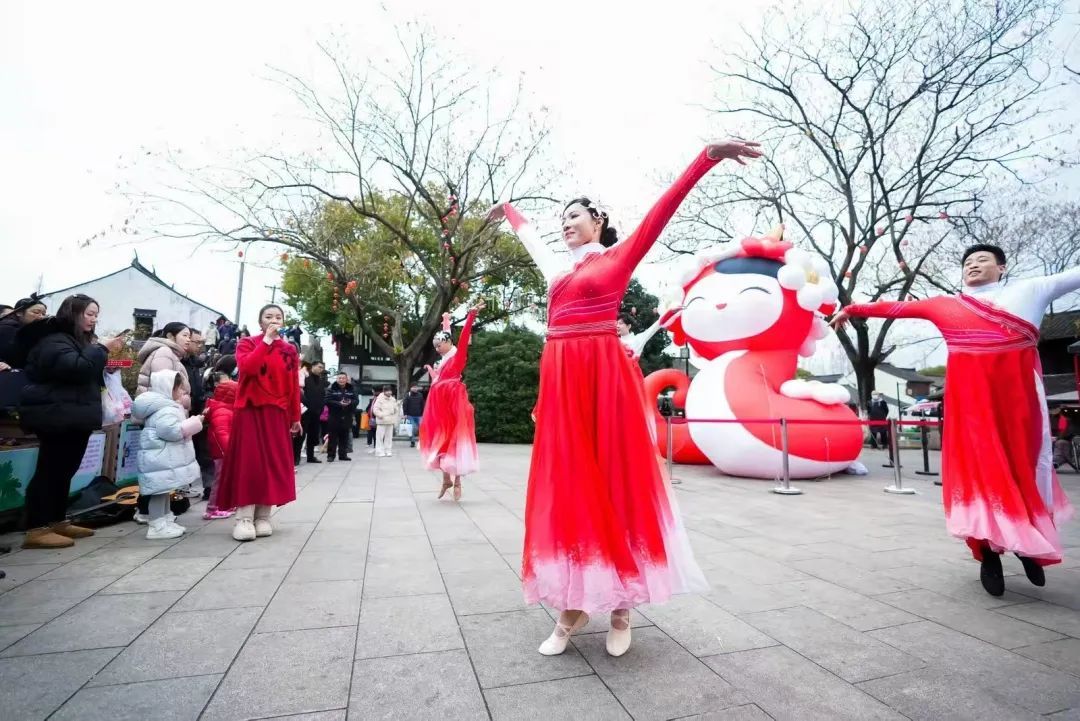 枫泾古镇旅游区精心策划了赏年灯、看年戏、逛年集、送年福等一系列精彩纷呈的活动。古风歌舞、乐器演奏、快闪舞蹈、鱼灯巡游……在古戏台、得泉亭、三桥广场等地轮番上演,丰富多彩的年戏节目为新年增添了喜庆祥和的氛围,同时也吸引了众多游客驻足观看。现场,设置的互动体验环节让市民游客近距离领略了传统文化的魅力,一位参与版画体验的小朋友兴奋地说:“这种简单方便的方式让我体会到了版画的独特魅力,太好玩了,感觉自己也成为了传统文化的传承者。”