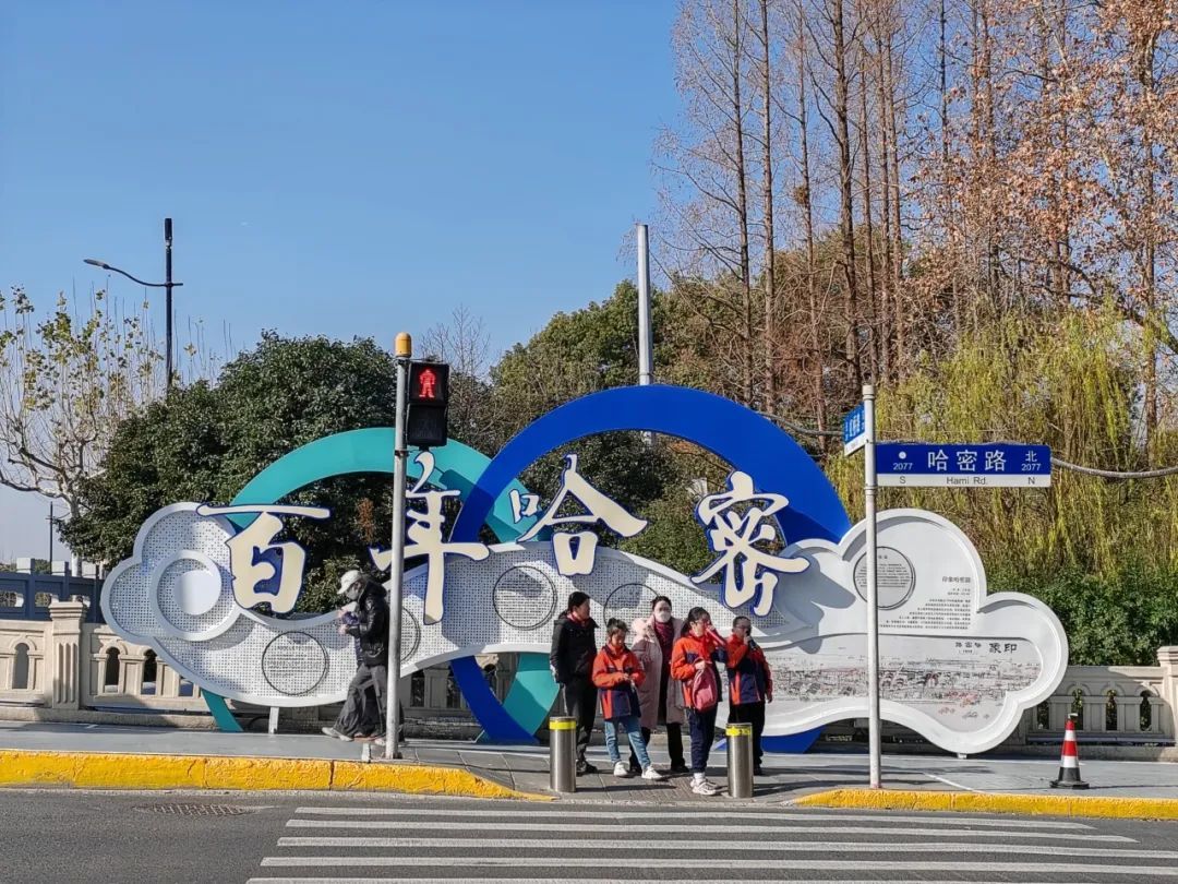程家桥下耸立着一座“如意与祥云”构成的“百年哈密”转角标识。书法与《印象哈密路》画卷都由社区能人所作。沿着防汛墙镶嵌着9块展示板,对龙柏饭店、沙逊别墅、罗别根花园和上海卫生疗养院旧址等西郊周边历史建筑作了介绍,充分展现百年哈密路的历史文化底蕴。两只小象组成的打卡框景,与上海动物园大门遥相呼应,可供游客在此拍照留念。