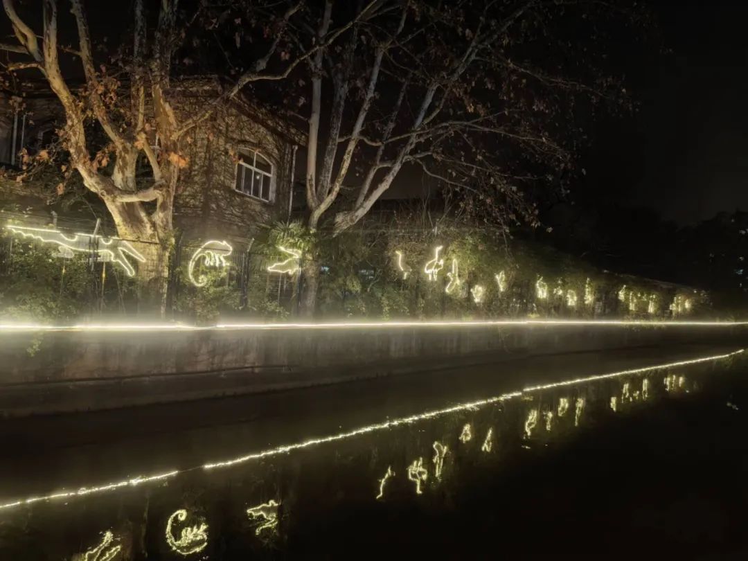 当夜幕降临,百年哈密路被五彩斑斓的灯光所点缀,道路两侧的转角标识、熊猫群组雕塑、小象打卡框景、幼儿园围墙墙绘等都将被红绿蓝紫的灯光照亮,而新泾港西侧依次亮起的动物霓虹灯,更是让整条街充满缤纷色彩。
