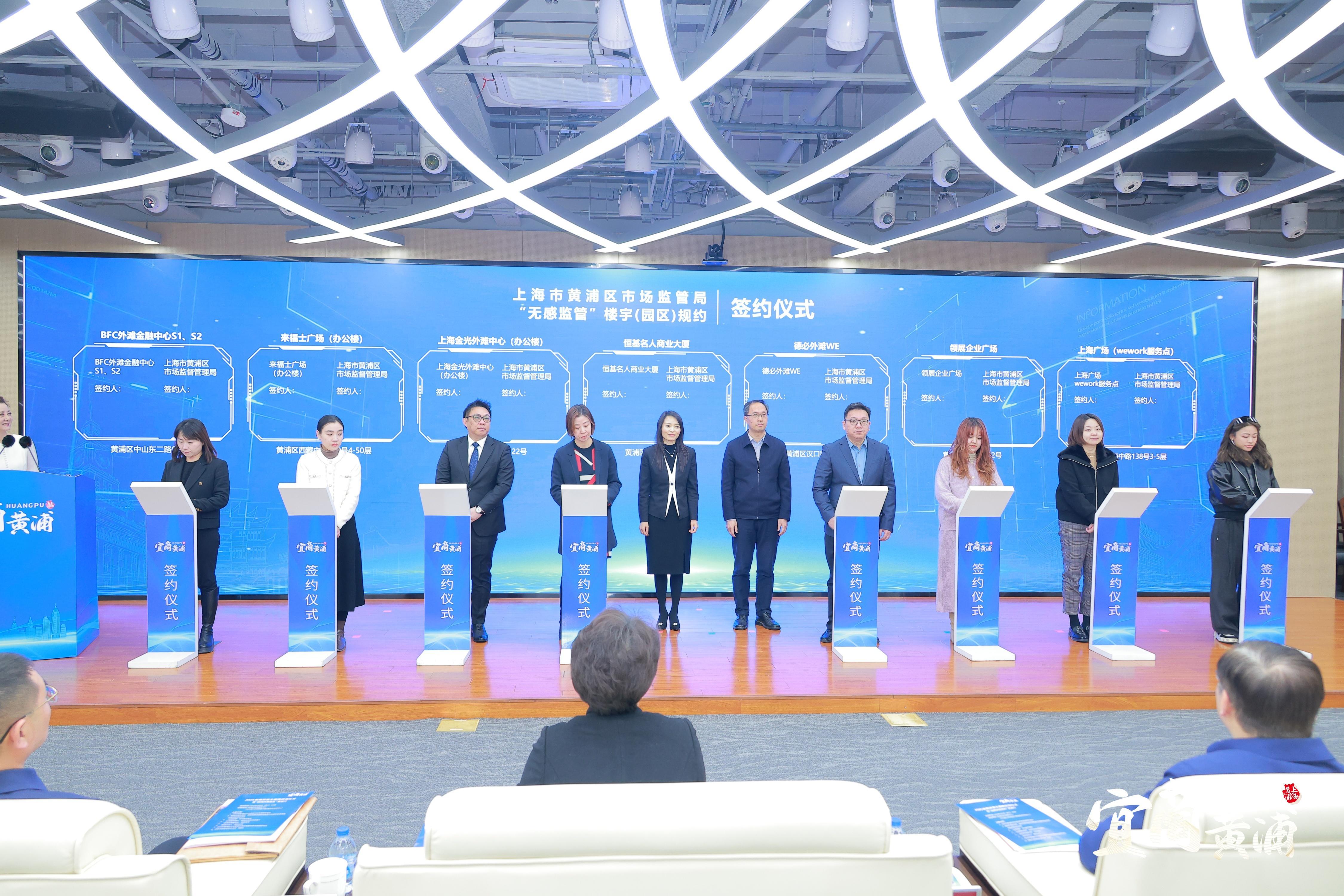 当天,区市场监管局与BFC外滩金融中心、来福士广场、上海金光外滩中心、恒基名人商业大厦、德必外滩WE、领展企业广场、上海广场7幢试点楼宇运营方现场签约。“无感监管”楼宇试点将首先在这7幢楼宇试点。