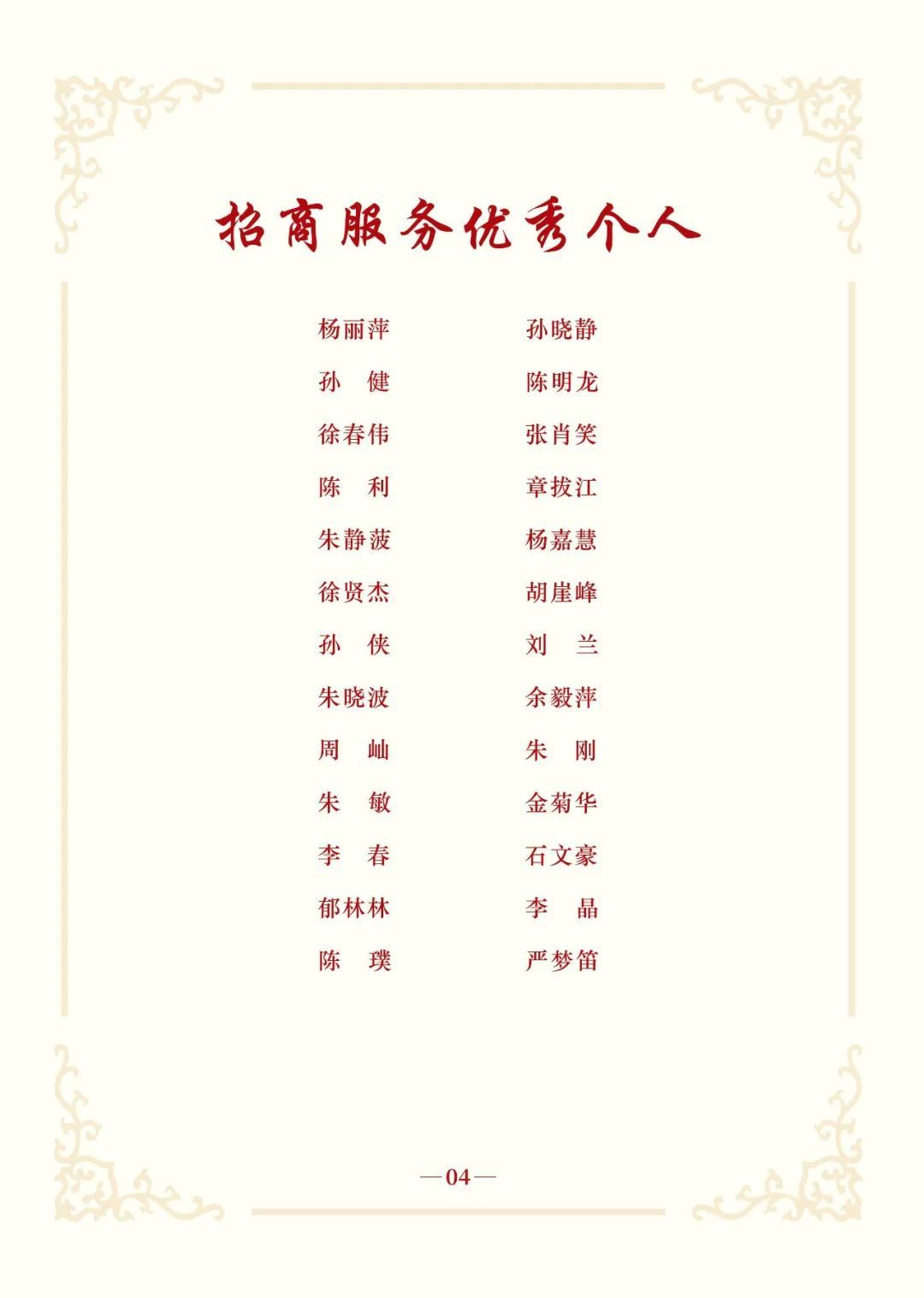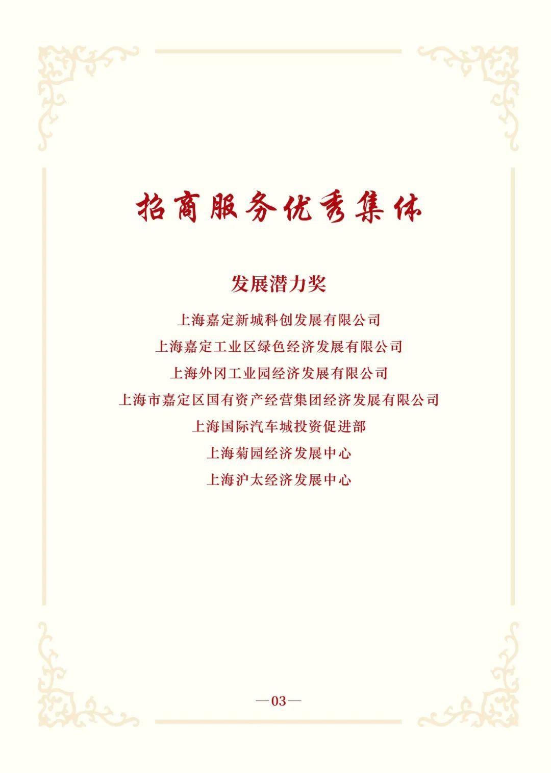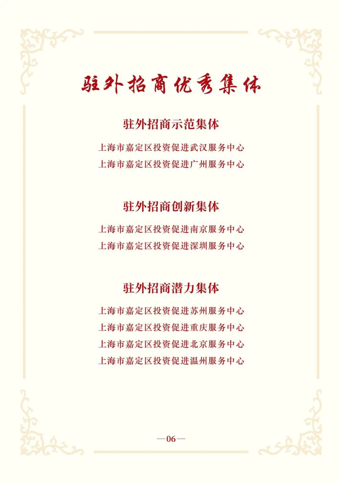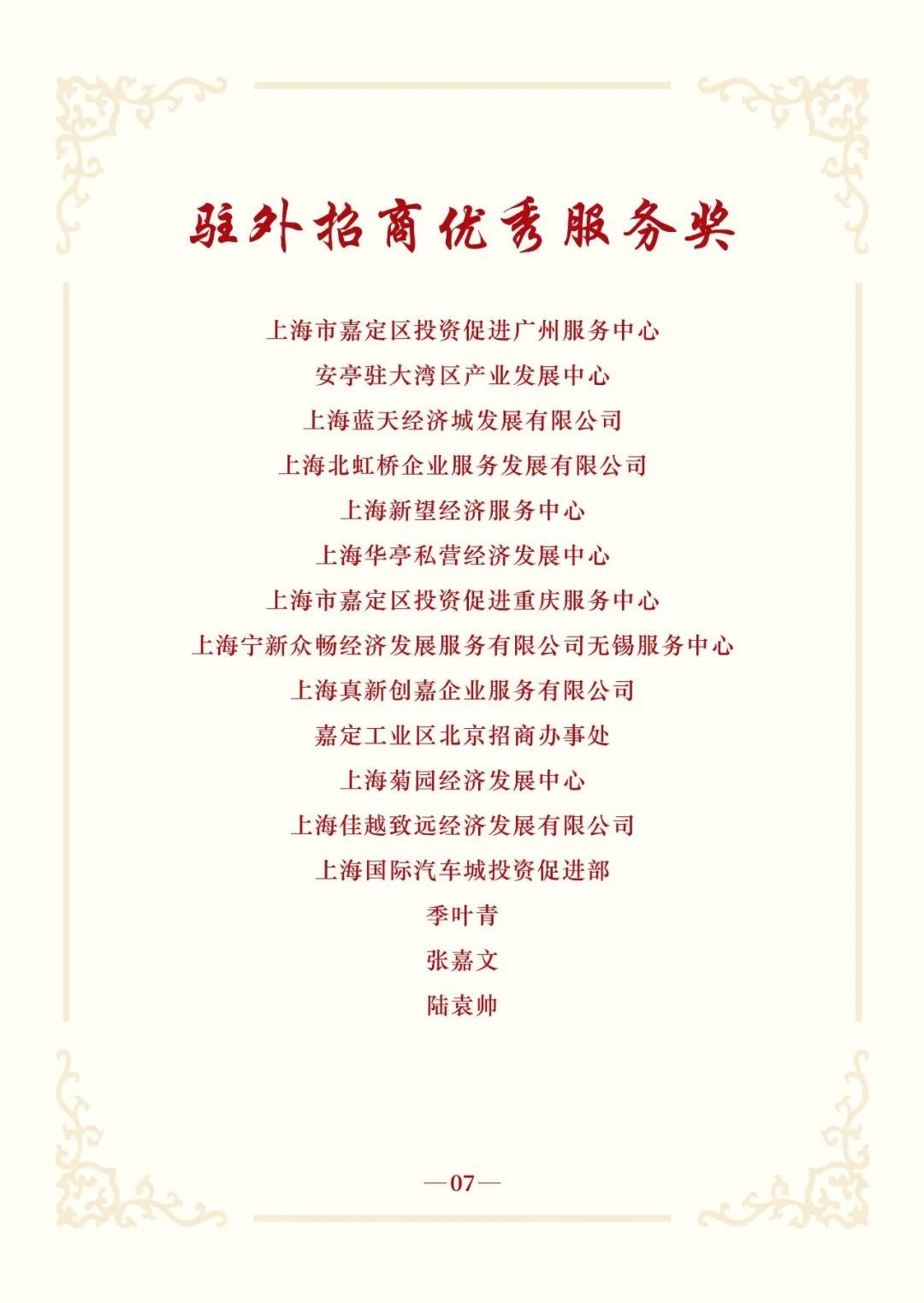 会上,上海大众经济城发展中心等16家集体荣获“2024年度嘉定区招商服务优秀集体”;杨丽萍等50人荣获“2024年度嘉定区招商服务优秀个人”;上海市嘉定区投资促进武汉服务中心等8个服务中心荣获“2024年度嘉定区驻外招商优秀集体”;上海市嘉定区投资促进日本联络点等3个联络点荣获“2024年度嘉定区优秀海外开拓奖”;上海市嘉定区投资促进广州服务中心等13个集体和季叶青等3人荣获“2024年度嘉定区驻外招商优秀服务奖”。联影医疗、上汽恒旭、仲量联行、中国传感器及物联网联盟等16家2025年新一批全球战略合作伙伴授牌。嘉定工业区、区商务委、汽车城集团和上海械谷4家单位围绕各自领域作交流发言。