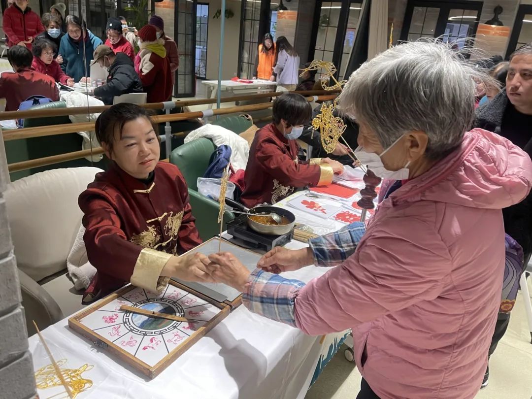 除了健康检测项目外,市集还融入了传统民俗元素,为居民们带来了别样的新年体验。传统糖画制作摊位前人头攒动,手艺人们用灵巧的双手将糖液绘制成栩栩如生的糖画,龙、蛇等造型精美绝伦,引得居民们纷纷驻足欣赏。