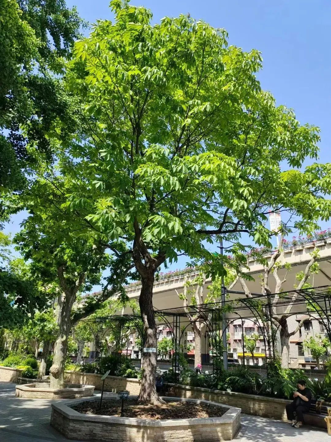 复兴公园古树群的景致,并不局限于法国梧桐,欧洲七叶树等高大乔木也是很珍稀。靠近高架桥边的这株七叶树不仅是上海市登记在册的古树名木中唯一的欧洲七叶树品种,也是复兴公园古树群的“明星”树,无论花、果、叶都具有独特的观赏价值,深受大家的喜爱。它在绿化工作者的精心呵护下,每年郁郁葱葱,蔚然成荫,成为市民游客休息纳凉的好去处。
