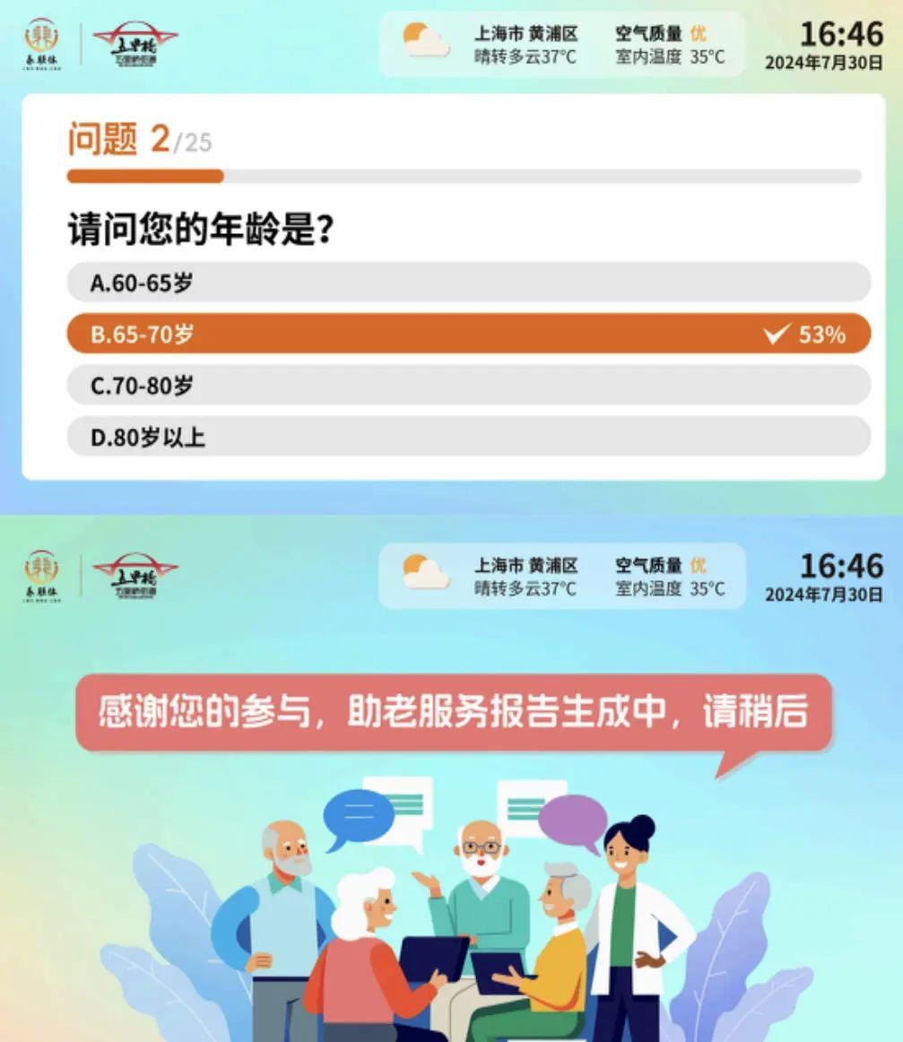 另一方面,依托信息技术,街道自主研发“政策体检机”,体检机内置智能问卷,只需勾选年龄段以及几道简单的是非题,政策体检机便会为居民生成个性化报告,将庞杂的个人情况及需求转化为一套清晰简明的个性化养老方案,初步了解服务需求后,能让后续政策服务推介更加高效。通过这种方式,街道将养老服务、政策宣传匹配嵌入到街道民政服务站、社区事务受理服务中心、居委会等场所,进一步升级了综合性服务阵地的养老服务效能。